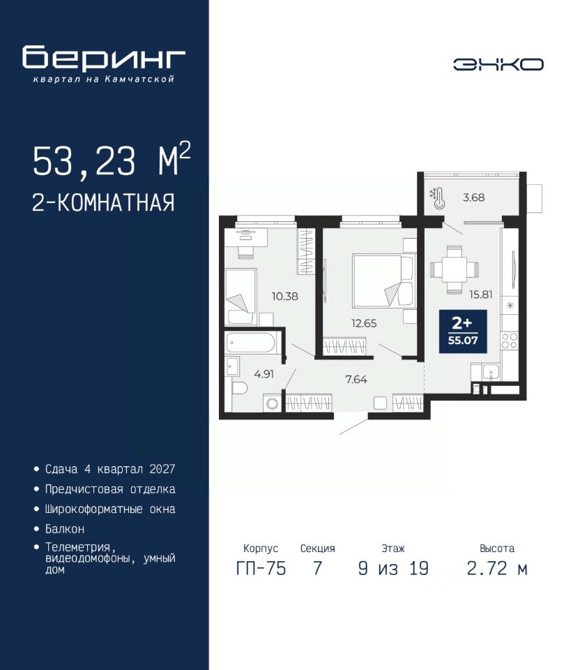 Продается двухкомнатная квартира с предчистовой отделкой в ЖК ''Беринг'' на 18 этаже. Общая площадь: 53.23 кв.м., жилая: 23.03 кв.м., площадь просторной кухни-столовой: 15.81 кв.м. Комнаты изолированные, все окна выходят на одну сторону. В квартире один балкон, один совмещенный санузел. Высота потолков 2.72 м. Дом монолитный, многоподъездный, переменной этажности, от 17 до 24 этажей. Квартира находится в 7-й секции высотой 19 этажей в корпусе ГП-75. На этаже 7 квартир. В подъезде 2 пассажирских и 1 грузовой лифт. Окончание строительства - 4 квартал 2027 года. Оформление сделки по договору долевого участия. Подобно знаменитому исследователю, мы чувствуем себя первооткрывателями этой локации. Хотим показать новую суть места, сформировать для вас жизненный опыт, которого ещё не было. Беринг — район зелёного цвета. Беринг — район, который откроется вам с другой стороны. Впечатлит новым уровнем комфорта и качеством жизни. Беринг — открытие на карте города. Первый квартал расположен в районе Тура, в границах улиц: Камчатская Западносибирская Энтузиастов. Вокруг уже есть всё для того, чтобы ежедневная рутина была лишь частью жизни и не доставляла дискомфорта. Школы и детские сады, магазины и аптеки, поликлиника, места для семейного отдыха, пеших и велопрогулок, и даже рыбалки. Масштабное озеленение дворов — визитная карточка ЭНКО и ваш оазис спокойствия, чтобы отвлечься от повседневности. Раскидистые деревья, кустарники, травы и цветы — осталось остановиться, вдохнуть и расслабиться, глядя на эту природную красоту. Стилистика подъездов продолжает концепцию Беринга, вдохновлённого Камчаткой: сдержанный, но при этом впечатляющий дизайн соседствует с удобством и функциональностью. #ZMg9vg