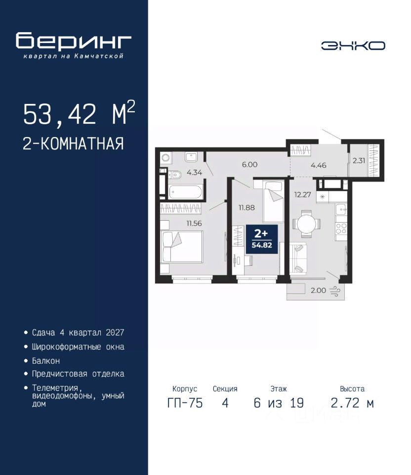 2-комн. квартира с предчистовой отделкой в ЖК ''Беринг'' на 6 этаже. Общая площадь: 53.42 кв.м., жилая: 23.44 кв.м., площадь просторной кухни-столовой: 12.27 кв.м. Комнаты изолированные, все окна выходят на одну сторону. В квартире один балкон, один совмещенный санузел. Высота потолков 2.72 м. Дом монолитный, многоподъездный, переменной этажности, от 17 до 24 этажей. Квартира находится в 4-й секции высотой 19 этажей в корпусе ГП-75. На этаже 4 квартиры. В подъезде 2 пассажирских и 1 грузовой лифт. Окончание строительства - 4 квартал 2027 года. Оформление сделки по договору долевого участия. Подобно знаменитому исследователю, мы чувствуем себя первооткрывателями этой локации. Хотим показать новую суть места, сформировать для вас жизненный опыт, которого ещё не было. Беринг — район зелёного цвета. Беринг — район, который откроется вам с другой стороны. Впечатлит новым уровнем комфорта и качеством жизни. Беринг — открытие на карте города. Первый квартал расположен в районе Тура, в границах улиц: Камчатская Западносибирская Энтузиастов. Вокруг уже есть всё для того, чтобы ежедневная рутина была лишь частью жизни и не доставляла дискомфорта. Школы и детские сады, магазины и аптеки, поликлиника, места для семейного отдыха, пеших и велопрогулок, и даже рыбалки. Масштабное озеленение дворов — визитная карточка ЭНКО и ваш оазис спокойствия, чтобы отвлечься от повседневности. Раскидистые деревья, кустарники, травы и цветы — осталось остановиться, вдохнуть и расслабиться, глядя на эту природную красоту. Стилистика подъездов продолжает концепцию Беринга, вдохновлённого Камчаткой: сдержанный, но при этом впечатляющий дизайн соседствует с удобством и функциональностью. #Zmggv1