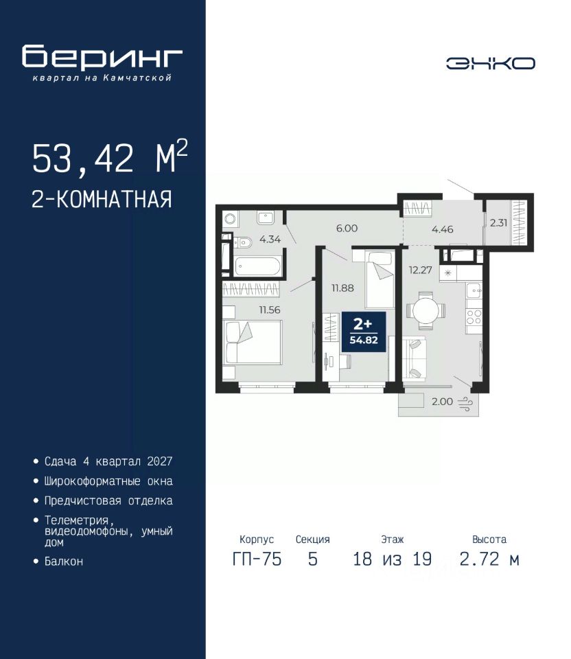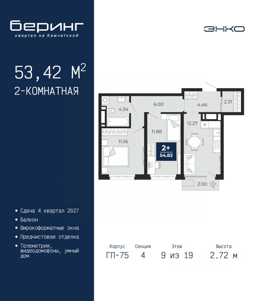 2-комн. квартира с предчистовой отделкой в ЖК ''Беринг'' на 18 этаже. Общая площадь: 53.42 кв.м., жилая: 23.44 кв.м., площадь просторной кухни-столовой: 12.27 кв.м. Комнаты изолированные, все окна выходят на одну сторону. В квартире один балкон, один совмещенный санузел. Высота потолков 2.72 м. Дом монолитный, многоподъездный, переменной этажности, от 17 до 24 этажей. Квартира находится в 5-й секции высотой 19 этажей в корпусе ГП-75. На этаже 4 квартиры. В подъезде 2 пассажирских и 1 грузовой лифт. Окончание строительства - 4 квартал 2027 года. Оформление сделки по договору долевого участия. Подобно знаменитому исследователю, мы чувствуем себя первооткрывателями этой локации. Хотим показать новую суть места, сформировать для вас жизненный опыт, которого ещё не было. Беринг — район зелёного цвета. Беринг — район, который откроется вам с другой стороны. Впечатлит новым уровнем комфорта и качеством жизни. Беринг — открытие на карте города. Первый квартал расположен в районе Тура, в границах улиц: Камчатская Западносибирская Энтузиастов. Вокруг уже есть всё для того, чтобы ежедневная рутина была лишь частью жизни и не доставляла дискомфорта. Школы и детские сады, магазины и аптеки, поликлиника, места для семейного отдыха, пеших и велопрогулок, и даже рыбалки. Масштабное озеленение дворов — визитная карточка ЭНКО и ваш оазис спокойствия, чтобы отвлечься от повседневности. Раскидистые деревья, кустарники, травы и цветы — осталось остановиться, вдохнуть и расслабиться, глядя на эту природную красоту. Стилистика подъездов продолжает концепцию Беринга, вдохновлённого Камчаткой: сдержанный, но при этом впечатляющий дизайн соседствует с удобством и функциональностью. #ZM9gvC