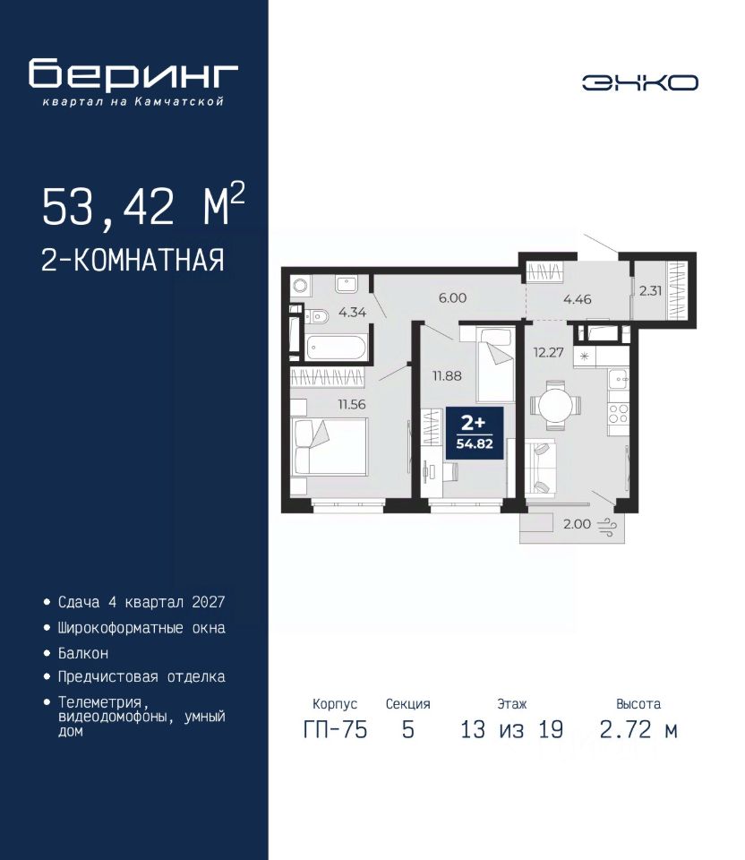 2-комн. квартира с предчистовой отделкой в ЖК ''Беринг'' на 13 этаже. Общая площадь: 53.42 кв.м., жилая: 23.44 кв.м., площадь просторной кухни-столовой: 12.27 кв.м. Комнаты изолированные, все окна выходят на одну сторону. В квартире один балкон, один совмещенный санузел. Высота потолков 2.72 м. Дом монолитный, многоподъездный, переменной этажности, от 17 до 24 этажей. Квартира находится в 5-й секции высотой 19 этажей в корпусе ГП-75. На этаже 4 квартиры. В подъезде 2 пассажирских и 1 грузовой лифт. Окончание строительства - 4 квартал 2027 года. Оформление сделки по договору долевого участия. Подобно знаменитому исследователю, мы чувствуем себя первооткрывателями этой локации. Хотим показать новую суть места, сформировать для вас жизненный опыт, которого ещё не было. Беринг — район зелёного цвета. Беринг — район, который откроется вам с другой стороны. Впечатлит новым уровнем комфорта и качеством жизни. Беринг — открытие на карте города. Первый квартал расположен в районе Тура, в границах улиц: Камчатская Западносибирская Энтузиастов. Вокруг уже есть всё для того, чтобы ежедневная рутина была лишь частью жизни и не доставляла дискомфорта. Школы и детские сады, магазины и аптеки, поликлиника, места для семейного отдыха, пеших и велопрогулок, и даже рыбалки. Масштабное озеленение дворов — визитная карточка ЭНКО и ваш оазис спокойствия, чтобы отвлечься от повседневности. Раскидистые деревья, кустарники, травы и цветы — осталось остановиться, вдохнуть и расслабиться, глядя на эту природную красоту. Стилистика подъездов продолжает концепцию Беринга, вдохновлённого Камчаткой: сдержанный, но при этом впечатляющий дизайн соседствует с удобством и функциональностью. #zmgg88