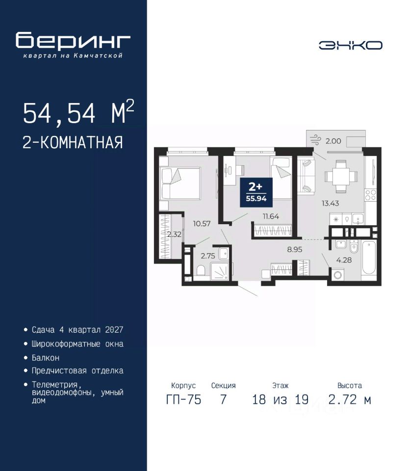 2-комн. квартира от застройщика с предчистовой отделкой в ЖК ''Беринг'' на 18 этаже. Общая площадь: 54.54 кв.м., жилая: 22.21 кв.м., площадь просторной кухни-столовой: 13.43 кв.м. Комнаты изолированные, все окна выходят на одну сторону. В квартире один балкон, два совмещенных санузла. Высота потолков 2.72 м. Дом монолитный, многоподъездный, переменной этажности, от 17 до 24 этажей. Квартира находится в 7-й секции высотой 19 этажей в корпусе ГП-75. На этаже 7 квартир. В подъезде 2 пассажирских и 1 грузовой лифт. Окончание строительства - 4 квартал 2027 года. Оформление сделки по договору долевого участия. Подобно знаменитому исследователю, мы чувствуем себя первооткрывателями этой локации. Хотим показать новую суть места, сформировать для вас жизненный опыт, которого ещё не было. Беринг — район зелёного цвета. Беринг — район, который откроется вам с другой стороны. Впечатлит новым уровнем комфорта и качеством жизни. Беринг — открытие на карте города. Первый квартал расположен в районе Тура, в границах улиц: Камчатская Западносибирская Энтузиастов. Вокруг уже есть всё для того, чтобы ежедневная рутина была лишь частью жизни и не доставляла дискомфорта. Школы и детские сады, магазины и аптеки, поликлиника, места для семейного отдыха, пеших и велопрогулок, и даже рыбалки. Масштабное озеленение дворов — визитная карточка ЭНКО и ваш оазис спокойствия, чтобы отвлечься от повседневности. Раскидистые деревья, кустарники, травы и цветы — осталось остановиться, вдохнуть и расслабиться, глядя на эту природную красоту. Стилистика подъездов продолжает концепцию Беринга, вдохновлённого Камчаткой: сдержанный, но при этом впечатляющий дизайн соседствует с удобством и функциональностью. #zm99gg