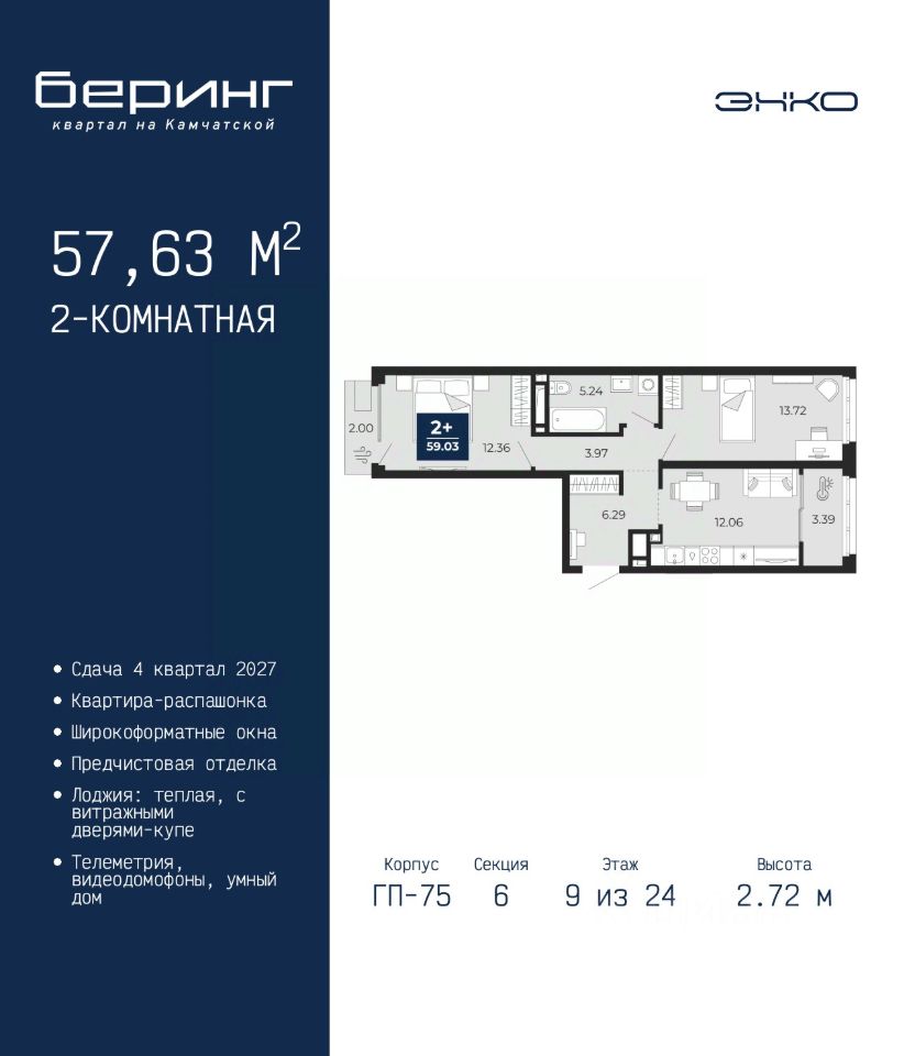Просторная 2-комн. квартира с предчистовой отделкой в ЖК ''Беринг'' на 2 этаже. Общая площадь: 58.88 кв.м., жилая: 26.08 кв.м., площадь просторной кухни-столовой: 12.06 кв.м. Квартира - распашонка, без проходных комнат, окна выходят на paзные стороны дома. В квартире один балкон и одна лоджия, один совмещенный санузел. Высота потолков 2.72 м. Дом монолитный, многоподъездный, переменной этажности, от 17 до 24 этажей. Квартира находится в 3-й секции высотой 24 этажа в корпусе ГП-75. На этаже 6 квартир. В подъезде 2 пассажирских и 1 грузовой лифт. Окончание строительства - 4 квартал 2027 года. Оформление сделки по договору долевого участия. Подобно знаменитому исследователю, мы чувствуем себя первооткрывателями этой локации. Хотим показать новую суть места, сформировать для вас жизненный опыт, которого ещё не было. Беринг — район зелёного цвета. Беринг — район, который откроется вам с другой стороны. Впечатлит новым уровнем комфорта и качеством жизни. Беринг — открытие на карте города. Первый квартал расположен в районе Тура, в границах улиц: Камчатская Западносибирская Энтузиастов. Вокруг уже есть всё для того, чтобы ежедневная рутина была лишь частью жизни и не доставляла дискомфорта. Школы и детские сады, магазины и аптеки, поликлиника, места для семейного отдыха, пеших и велопрогулок, и даже рыбалки. Масштабное озеленение дворов — визитная карточка ЭНКО и ваш оазис спокойствия, чтобы отвлечься от повседневности. Раскидистые деревья, кустарники, травы и цветы — осталось остановиться, вдохнуть и расслабиться, глядя на эту природную красоту. Стилистика подъездов продолжает концепцию Беринга, вдохновлённого Камчаткой: сдержанный, но при этом впечатляющий дизайн соседствует с удобством и функциональностью. #2mg995