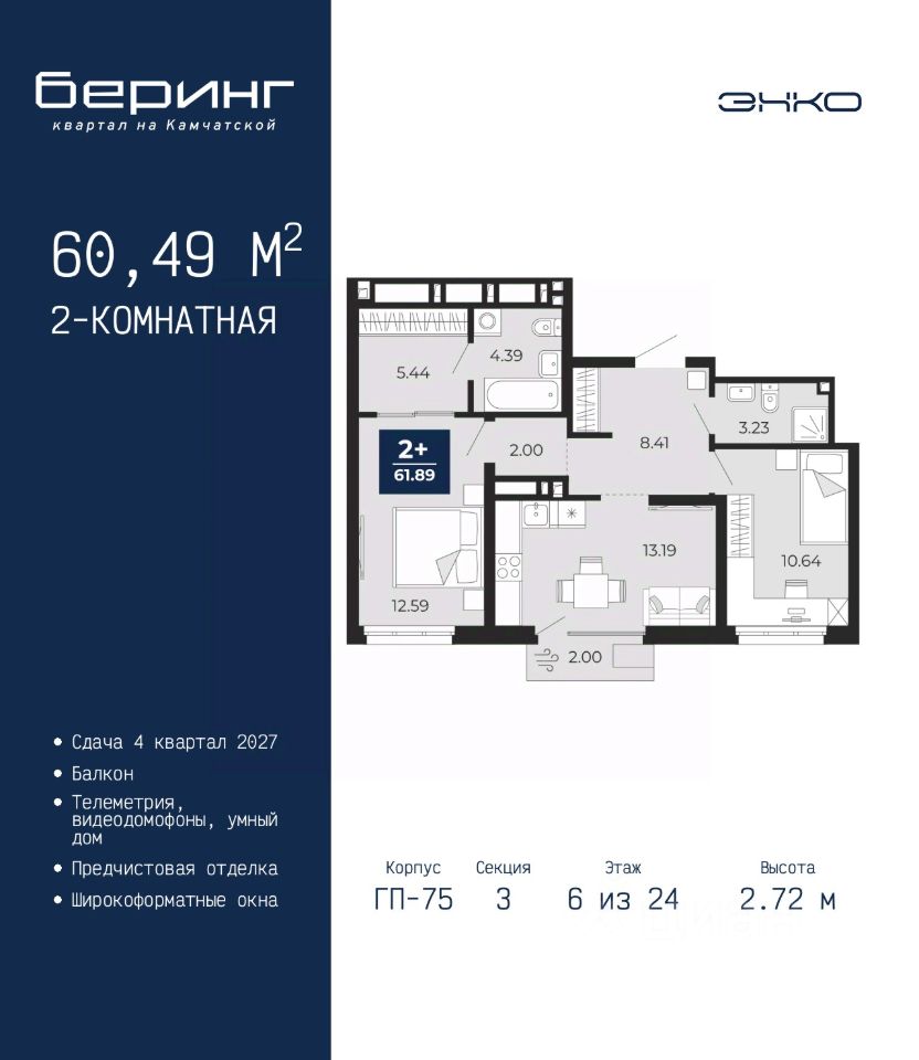 2-комн. квартира от застройщика с предчистовой отделкой в ЖК ''Беринг'' на 13 этаже. Общая площадь: 60.49 кв.м., жилая: 23.23 кв.м., площадь просторной кухни-столовой: 13.19 кв.м. Комнаты изолированные, все окна выходят на одну сторону. В квартире один балкон, два совмещенных санузла. Высота потолков 2.72 м. Дом монолитный, многоподъездный, переменной этажности, от 17 до 24 этажей. Квартира находится в 3-й секции высотой 24 этажа в корпусе ГП-75. На этаже 6 квартир. В подъезде 2 пассажирских и 1 грузовой лифт. Окончание строительства - 4 квартал 2027 года. Оформление сделки по договору долевого участия. Подобно знаменитому исследователю, мы чувствуем себя первооткрывателями этой локации. Хотим показать новую суть места, сформировать для вас жизненный опыт, которого ещё не было. Беринг — район зелёного цвета. Беринг — район, который откроется вам с другой стороны. Впечатлит новым уровнем комфорта и качеством жизни. Беринг — открытие на карте города. Первый квартал расположен в районе Тура, в границах улиц: Камчатская Западносибирская Энтузиастов. Вокруг уже есть всё для того, чтобы ежедневная рутина была лишь частью жизни и не доставляла дискомфорта. Школы и детские сады, магазины и аптеки, поликлиника, места для семейного отдыха, пеших и велопрогулок, и даже рыбалки. Масштабное озеленение дворов — визитная карточка ЭНКО и ваш оазис спокойствия, чтобы отвлечься от повседневности. Раскидистые деревья, кустарники, травы и цветы — осталось остановиться, вдохнуть и расслабиться, глядя на эту природную красоту. Стилистика подъездов продолжает концепцию Беринга, вдохновлённого Камчаткой: сдержанный, но при этом впечатляющий дизайн соседствует с удобством и функциональностью. #ZmggCZ