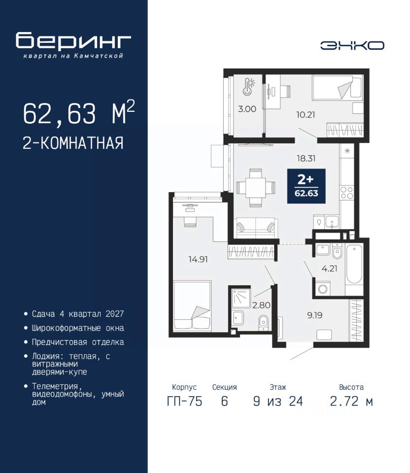 Продается двухкомнатная квартира с предчистовой отделкой в ЖК ''Беринг'' на 9 этаже. Общая площадь: 62.63 кв.м., жилая: 25.12 кв.м., площадь просторной кухни-столовой: 18.31 кв.м. Комнаты изолированные, все окна выходят на одну сторону. В квартире одна лоджия, два совмещенных санузла. Высота потолков 2.72 м. Дом монолитный, многоподъездный, переменной этажности, от 17 до 24 этажей. Квартира находится в 6-й секции высотой 24 этажа в корпусе ГП-75. На этаже 6 квартир. В подъезде 2 пассажирских и 1 грузовой лифт. Окончание строительства - 4 квартал 2027 года. Оформление сделки по договору долевого участия. Подобно знаменитому исследователю, мы чувствуем себя первооткрывателями этой локации. Хотим показать новую суть места, сформировать для вас жизненный опыт, которого ещё не было. Беринг — район зелёного цвета. Беринг — район, который откроется вам с другой стороны. Впечатлит новым уровнем комфорта и качеством жизни. Беринг — открытие на карте города. Первый квартал расположен в районе Тура, в границах улиц: Камчатская Западносибирская Энтузиастов. Вокруг уже есть всё для того, чтобы ежедневная рутина была лишь частью жизни и не доставляла дискомфорта. Школы и детские сады, магазины и аптеки, поликлиника, места для семейного отдыха, пеших и велопрогулок, и даже рыбалки. Масштабное озеленение дворов — визитная карточка ЭНКО и ваш оазис спокойствия, чтобы отвлечься от повседневности. Раскидистые деревья, кустарники, травы и цветы — осталось остановиться, вдохнуть и расслабиться, глядя на эту природную красоту. Стилистика подъездов продолжает концепцию Беринга, вдохновлённого Камчаткой: сдержанный, но при этом впечатляющий дизайн соседствует с удобством и функциональностью. #zm9gCU