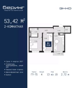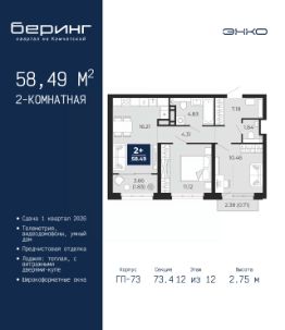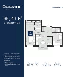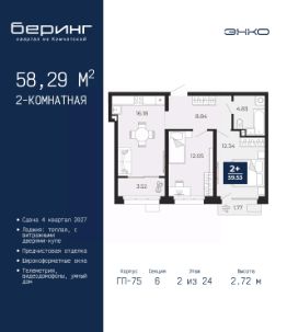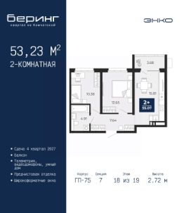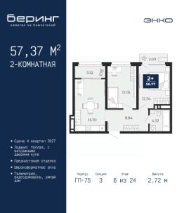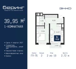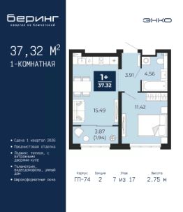 Однокомнатная квартира от застройщика с предчистовой отделкой в ЖК ''Беринг'' на 17 этаже. Общая площадь: 38.62 кв.м., жилая: 10.92 кв.м., площадь просторной кухни-столовой: 18.6 кв.м. Все окна выходят на одну сторону. В квартире два балкона, один совмещенный санузел. Высота потолков 2.72 м. Дом монолитный, черырехподъездный, переменной этажности, от 19 до 24 этажей. Квартира находится в 1-й секции высотой 23 этажа в корпусе ГП-76. На этаже 7 квартир. В подъезде 2 пассажирских и 1 грузовой лифт. Окончание строительства - 4 квартал 2027 года. Оформление сделки по договору долевого участия. Подобно знаменитому исследователю, мы чувствуем себя первооткрывателями этой локации. Хотим показать новую суть места, сформировать для вас жизненный опыт, которого ещё не было. Беринг — район зелёного цвета. Беринг — район, который откроется вам с другой стороны. Впечатлит новым уровнем комфорта и качеством жизни. Беринг — открытие на карте города. Первый квартал расположен в районе Тура, в границах улиц: Камчатская Западносибирская Энтузиастов. Вокруг уже есть всё для того, чтобы ежедневная рутина была лишь частью жизни и не доставляла дискомфорта.Школы и детские сады, магазины и аптеки, поликлиника, места для семейного отдыха, пеших и велопрогулок, и даже рыбалки. Масштабное озеленение дворов — визитная карточка ЭНКО и ваш оазис спокойствия, чтобы отвлечься от повседневности. Раскидистые деревья, кустарники, травы и цветы — осталось остановиться, вдохнуть и расслабиться, глядя на эту природную красоту. Стилистика подъездов продолжает концепцию Беринга, вдохновлённого Камчаткой: сдержанный,но при этом впечатляющий дизайн соседствует с удобством и функциональностью. #2Mmb7e