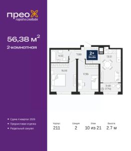 Торопитесь оформить бронирование на этих условиях, предложение ограничено! Стоимость квартиры указана со скидкой, ваша экономия составит 404,300 руб. Звоните, мы вам все подробно расскажем. 2-комн. квартира от застройщика с предчистовой отделкой в ЖК ''Прео'' на 10 этаже. Общая площадь: 56.38 кв.м. Высота потолков 2.7 м. Дом монолитный, черырехподъездный, переменной этажности, от 14 до 21 этажей. Квартира находится во 2-й секции высотой 21 этаж в корпусе 211. На этаже 10 квартир. В подъезде 1 пассажирский и 1 грузовой лифт. Окончание строительства - 4 квартал 2026 года. Оформление сделки по договору долевого участия. Преображенский — один из самых привлекательных районов для жизни! Это полностью самостоятельный жилой район с точки зрения инфраструктуры. Преображенский находится между Московским и Червишевским трактами в квартале улиц Закалужская — Вьюжная — Александра Протозанова. Не нужно ждать, когда появится инфраструктура — переезжайте на всё готовое. Вблизи расположены действующие школа и детский сад. В этом году откроется еще один сад, а в следующем году — школа. По соседству с Преображенским запланировано строительство городского парка ''Комарово'' площадью 38 гектар. За 10 минут можно доехать на автомобиле до крупных ТРЦ: ''Лента'', ''Кристалл'', ''Леруа Мерлен'', ''Метро'' и ''Ашан''. С 2018 года в районе открыт Соседский центр — пространство, созданное для формирования добрососедской среды, совместного досуга, общения и реализации соседских инициатив. Здесь проходят встречи соседей, а также сами жители района организовывают мероприятия. Организатором такого события может стать любой желающий. В квартирах выполнена качественная предчистовая отделка. Гладкие стены с финишным выравниванием по маякам. Ровный потолок для установки натяжного потолка. Установлены пятикамерные окна с двойным стеклопакетом (3 стекла). Дизайнерские холлы с видеонаблюдением, безбарьерным и прозрачным входом всегда светло и спокойно. На первом этаже есть просторные колясочные, где все жители могут оставлять свои коляски и велосипеды. В Преображенском есть всё, что нужно для активного отдыха и занятий спортом. Мы сделали большое футбольное поле с безопасным покрытием. Также установили хоккейный корт, который оборудован по всем необходимым стандартам. Во дворах можно делать упражнения на специальных площадках с турниками. Весь район мы обустроили велодорожками, которые связаны в единый маршрут. У нас есть сухие фонтаны, бьющие из земли, деревья, веревки, сетки, скалодром, газон, песок и резинка — осталось просто дать своему ребенку право на свободную игру. По-настоящему хорошие дворы — это те, которые дети предпочитают соцсетям и телевизору. Аккредитация в банках: ПАО ''Газпромбанк'', ПАО Банк ''ВТБ'', ПАО ''Банк Уралсиб'', ОАО ''Альфа-Банк'', ''Сбербанк России'' и других. #z6E6V0