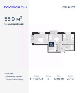 Продается 2-комн. квартира от застройщика с предчистовой отделкой в ЖК ''Мириады'' на 10 этаже. Общая площадь: 55.9 кв.м. Высота потолков 2.7 м. Дом монолитный, трехподъездный, переменной этажности, от 14 до 16 этажей. Квартира находится во 2-й секции высотой 16 этажей в корпусе ГП-72.103. На этаже 6 квартир. В подъезде 1 пассажирский и 1 грузовой лифт. На сегодняшний день строительство окончено, дом сдан в 4 квартале 2025 года. Оформление сделки по договору купли-продажи. Вселенная бесконечных историй. Ранее невиданный Тюмени масштаб: территория 240 гектаров и 1 650 000 м² застройки. Мириады это город масштабных перемен и больших возможностей. Город зеленых рощ и зеркальных озер. Город для работы, учебы и развлечений. Город для детей и их родителей. Город для всех и каждого. Проект расположен в районе Мыс рядом с ТРЦ ''Тюмень Сити Молл'' в границах улицы Тимофея Чаркова, Тобольского тракта и объездной дороги. Срок полного освоения территории - до 2034 года. #zMemVI