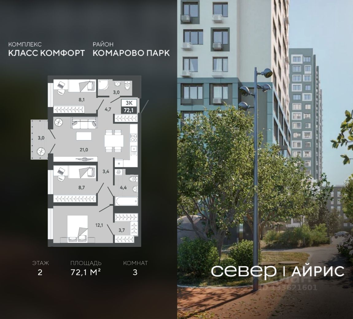 Продаётся квартира площадью 72.1 м2 в жилом комплексе ''Айрис''. Квартира находится на 2 этаже, жилая площадь квартиры 28.9 м2, площадь просторной кухни — 21 м2. Среди особенностей планировки — изолированные комнаты с окнами на одну сторону, 1 совмещённый санузел. Срок сдачи — III кв. 2027 Жилой комплекс ''Айрис'' — это: - фиджитал-квартал в Тюмени - дома высотой от 7 до 25 этажей - квартиры с системой ''Умный дом'' - цифровые технологии как элемент благоустройства Окружение В нескольких минутах ходьбы от дома — парк ''Комарово'' с волейбольной площадкой, открытым кинотеатром, зонами для барбекю и катком. Неподалеку от Airis находится центр иппотерапии, где можно покататься на лошадях и взять уроки верховой езды. На территории Airis появится собственный парк с прогулочными аллеями. Инфраструктура В 5-10 минутах от квартала открыты 2 детских сада и гимназия. На шопинг можно отправиться в торговые комплексы ''Колумб'' и ''Кристалл'' — они находятся недалеко от дома. Благоустройство Уютный двор — приватное пространство для жителей. В беседках можно будет почитать книгу в тишине, а в тени деревьев устроиться на пикник. На крыше многоуровневого паркинга будет лаунж-зона с кинотеатром, баскетбольная площадка и воркаут-пространство, где можно позаниматься с виртуальным тренером — достаточно отсканировать код. Лобби Интерьеры лобби выполнены в пастельных тонах с элементами фиджитал-решений. Для отдыха и ожидания гостей создана лаунж-зона. Также есть гостевые санузлы. Колясочные Возвращайтесь налегке после прогулки с малышом — оставить коляску можно в специальном помещении на первом этаже. Кладовые Для сезонных и габаритных вещей предусмотрены отдельные кладовые на цокольном этаже. В каждом помещении уже проведено электричество и выполнена стяжка пола. Паркинг На территории — два многоуровневых наземных паркинга. Один из них примыкает к домам — из него можно напрямую пройти в парадные. Планировки Планировки квартала — от компактной студии до сити-хауса с собственным палисадником — соответствуют любым жизненным сценариям. Можно выбрать квартиры с террасами и готовыми дизайнерскими интерьерами.