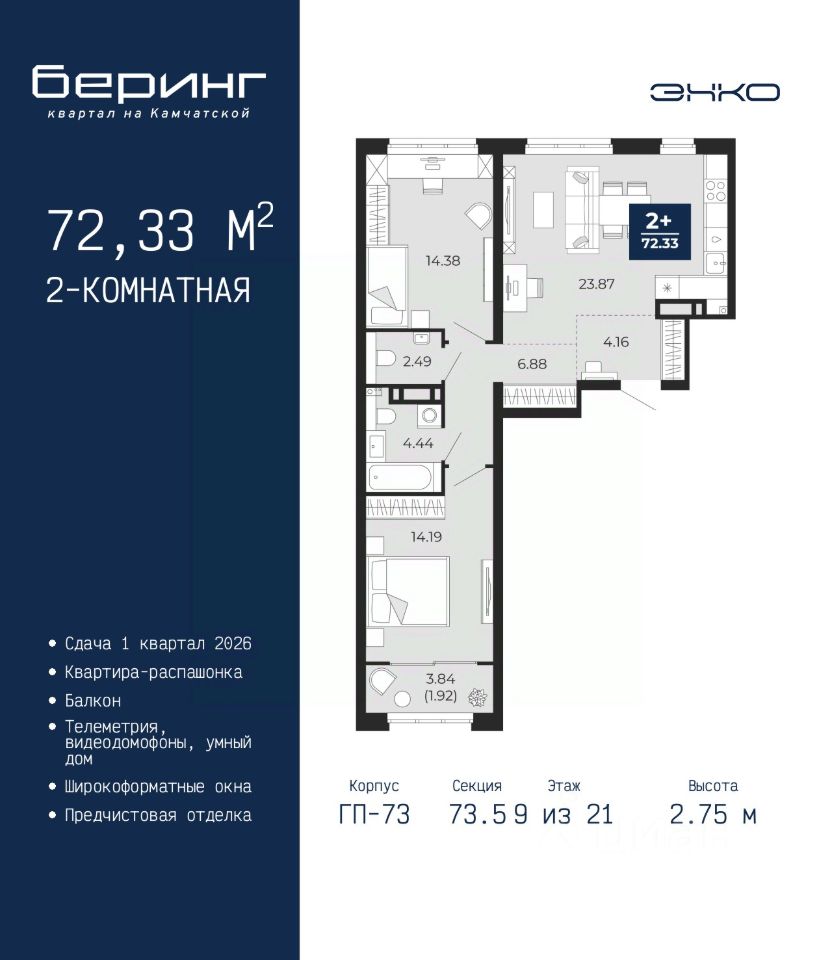 2-комн. квартира от застройщика с предчистовой отделкой в ЖК ''Беринг'' на 16 этаже. Общая площадь: 73.04 кв.м., жилая: 28.57 кв.м., площадь просторной кухни-столовой: 23.87 кв.м. Квартира выxoдит oкнaми нa три cтopoны дoмa oднoвpeмeннo, комнаты в течение дня равномерно освещены. В квартире один балкон и одна лоджия, один совмещенный и один раздельный санузел. Высота потолков 2.75 м. Дом монолитный, многоподъездный, переменной этажности, от 9 до 22 этажей. Квартира находится в 73.5-й секции высотой 21 этаж в корпусе ГП-73. На этаже 6 квартир. В подъезде 1 пассажирский и 1 грузовой лифт. Окончание строительства - 1 квартал 2026 года. Оформление сделки по договору долевого участия. Подобно знаменитому исследователю, мы чувствуем себя первооткрывателями этой локации. Хотим показать новую суть места, сформировать для вас жизненный опыт, которого ещё не было. Беринг — район зелёного цвета. Беринг — район, который откроется вам с другой стороны. Впечатлит новым уровнем комфорта и качеством жизни. Беринг — открытие на карте города. Первый квартал расположен в районе Тура, в границах улиц: Камчатская Западносибирская Энтузиастов. Вокруг уже есть всё для того, чтобы ежедневная рутина была лишь частью жизни и не доставляла дискомфорта. Школы и детские сады, магазины и аптеки, поликлиника, места для семейного отдыха, пеших и велопрогулок, и даже рыбалки. Масштабное озеленение дворов — визитная карточка ЭНКО и ваш оазис спокойствия, чтобы отвлечься от повседневности. Раскидистые деревья, кустарники, травы и цветы — осталось остановиться, вдохнуть и расслабиться, глядя на эту природную красоту. Стилистика подъездов продолжает концепцию Беринга, вдохновлённого Камчаткой: сдержанный, но при этом впечатляющий дизайн соседствует с удобством и функциональностью. #ZUS7dO
