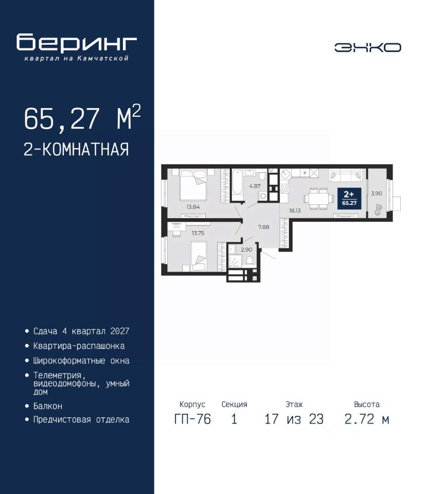 Продается 2-комн. квартира от застройщика с предчистовой отделкой в ЖК ''Беринг'' на 17 этаже. Общая площадь: 65.27 кв.м., жилая: 27.59 кв.м., площадь просторной кухни-столовой: 18.13 кв.м. Квартира - распашонка, без проходных комнат, окна выходят на paзные стороны дома. В квартире один балкон, два совмещенных санузла. Высота потолков 2.72 м. Дом монолитный, черырехподъездный, переменной этажности, от 19 до 24 этажей. Квартира находится в 1-й секции высотой 23 этажа в корпусе ГП-76. На этаже 7 квартир. В подъезде 2 пассажирских и 1 грузовой лифт. Окончание строительства - 4 квартал 2027 года. Оформление сделки по договору долевого участия. Подобно знаменитому исследователю, мы чувствуем себя первооткрывателями этой локации. Хотим показать новую суть места, сформировать для вас жизненный опыт, которого ещё не было. Беринг — район зелёного цвета. Беринг — район, который откроется вам с другой стороны. Впечатлит новым уровнем комфорта и качеством жизни. Беринг — открытие на карте города. Первый квартал расположен в районе Тура, в границах улиц: Камчатская Западносибирская Энтузиастов. Вокруг уже есть всё для того, чтобы ежедневная рутина была лишь частью жизни и не доставляла дискомфорта. Школы и детские сады, магазины и аптеки, поликлиника, места для семейного отдыха, пеших и велопрогулок, и даже рыбалки. Масштабное озеленение дворов — визитная карточка ЭНКО и ваш оазис спокойствия, чтобы отвлечься от повседневности. Раскидистые деревья, кустарники, травы и цветы — осталось остановиться, вдохнуть и расслабиться, глядя на эту природную красоту. Стилистика подъездов продолжает концепцию Беринга, вдохновлённого Камчаткой: сдержанный, но при этом впечатляющий дизайн соседствует с удобством и функциональностью. #z6Mbva