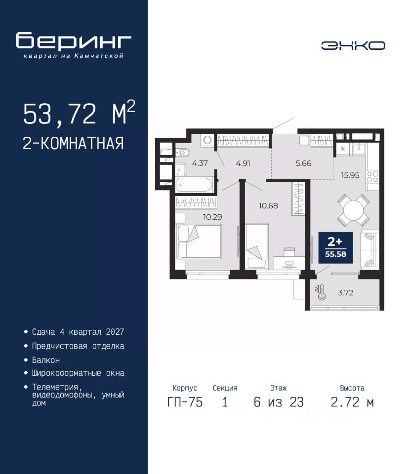 2-комн. квартира с предчистовой отделкой в ЖК ''Беринг'' на 6 этаже. Общая площадь: 53.72 кв.м., жилая: 20.97 кв.м., площадь просторной кухни-столовой: 15.95 кв.м. Комнаты изолированные, все окна выходят на одну сторону. В квартире один балкон, один совмещенный санузел. Высота потолков 2.72 м. Дом монолитный, многоподъездный, переменной этажности, от 17 до 24 этажей. Квартира находится в 1-й секции высотой 23 этажа в корпусе ГП-75. На этаже 8 квартир. В подъезде 2 пассажирских и 1 грузовой лифт. Окончание строительства - 4 квартал 2027 года. Оформление сделки по договору долевого участия. Подобно знаменитому исследователю, мы чувствуем себя первооткрывателями этой локации. Хотим показать новую суть места, сформировать для вас жизненный опыт, которого ещё не было. Беринг — район зелёного цвета. Беринг — район, который откроется вам с другой стороны. Впечатлит новым уровнем комфорта и качеством жизни. Беринг — открытие на карте города. Первый квартал расположен в районе Тура, в границах улиц: Камчатская Западносибирская Энтузиастов. Вокруг уже есть всё для того, чтобы ежедневная рутина была лишь частью жизни и не доставляла дискомфорта. Школы и детские сады, магазины и аптеки, поликлиника, места для семейного отдыха, пеших и велопрогулок, и даже рыбалки. Масштабное озеленение дворов — визитная карточка ЭНКО и ваш оазис спокойствия, чтобы отвлечься от повседневности. Раскидистые деревья, кустарники, травы и цветы — осталось остановиться, вдохнуть и расслабиться, глядя на эту природную красоту. Стилистика подъездов продолжает концепцию Беринга, вдохновлённого Камчаткой: сдержанный, но при этом впечатляющий дизайн соседствует с удобством и функциональностью. #26g97d