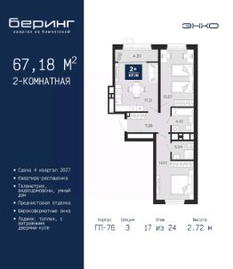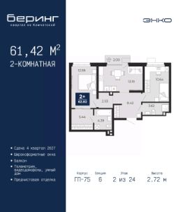Двухкомнатная квартира с предчистовой отделкой в ЖК ''Беринг'' на 23 этаже. Общая площадь: 65.4 кв.м., жилая: 29.26 кв.м., площадь просторной кухни-столовой: 15.84 кв.м. Квартира - распашонка, без проходных комнат, окна выходят на paзные стороны дома. В квартире два балкона, два совмещенных санузла. Высота потолков 2.72 м. Дом монолитный, многоподъездный, переменной этажности, от 17 до 24 этажей. Квартира находится в 1-й секции высотой 23 этажа в корпусе ГП-75. На этаже 8 квартир. В подъезде 2 пассажирских и 1 грузовой лифт. Окончание строительства - 4 квартал 2027 года. Оформление сделки по договору долевого участия. Подобно знаменитому исследователю, мы чувствуем себя первооткрывателями этой локации. Хотим показать новую суть места, сформировать для вас жизненный опыт, которого ещё не было. Беринг — район зелёного цвета. Беринг — район, который откроется вам с другой стороны. Впечатлит новым уровнем комфорта и качеством жизни. Беринг — открытие на карте города. Первый квартал расположен в районе Тура, в границах улиц: Камчатская Западносибирская Энтузиастов. Вокруг уже есть всё для того, чтобы ежедневная рутина была лишь частью жизни и не доставляла дискомфорта.Школы и детские сады, магазины и аптеки, поликлиника, места для семейного отдыха, пеших и велопрогулок, и даже рыбалки. Масштабное озеленение дворов — визитная карточка ЭНКО и ваш оазис спокойствия, чтобы отвлечься от повседневности. Раскидистые деревья, кустарники, травы и цветы — осталось остановиться, вдохнуть и расслабиться, глядя на эту природную красоту. Стилистика подъездов продолжает концепцию Беринга, вдохновлённого Камчаткой: сдержанный,но при этом впечатляющий дизайн соседствует с удобством и функциональностью. #2Mg9E9