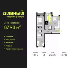 Продается 3-комн. квартира с предчистовой отделкой в ЖК ''Дивный квартал у озера'' на 2 этаже. Общая площадь: 87.98 кв.м., жилая: 47.33 кв.м., площадь просторной кухни-столовой: 16.54 кв.м. Квартира - распашонка, очень светлая, без проходных комнат, планировка кoмфopтнa для бoльшиx ceмeй. В квартире одна лоджия, один совмещенный и один раздельный санузел. Высота потолков 2.7 м. Квартира будет сдаваться с предчистовой отделкой White Box: выровнены и оштукатурены стены, проведено электричество и отопление, установлены радиаторы. Вы также можете приобрести квартиру с ремонтом от застройщика, представленным в трех цветовых решениях Scandi, Wood и Coffee и включающим: ламинат, обои под покраску, двери, натяжной потолок, санузел с сантехникой. При желании вы можете заказать отделку под ключ, варианты возможных решений представлены в альбоме фотографий. Дом монолитный, черырехподъездный, переменной этажности, от 13 до 23 этажей. Квартира находится в 3-й секции высотой 17 этажей в корпусе ГП-2. На этаже 5 квартир. В подъезде 1 пассажирский и 1 грузовой лифт. В настоящее время строительство окончено, дом сдан во 2 квартале 2023 года. Оформление сделки по договору купли-продажи. ''Дивный квартал у озера'' современный жилой квартал, удобно расположенный в 10-ти минутах от центра Тюмени, в уютном районе рядом с зеленым массивом и озером Алебашево. Комплекс находится между улицами Мельникайте и Алебашевская, что обеспечивает его хорошую транспортную доступность до центра на автомобиле всего 10 минут. Рядом с комплексом расположен Лесопарк имени Гагарина, экзотический Парк дружбы между Россией и Республикой Корея. ''Дивный квартал у озера'' объединяет архитектуру современной городской застройки и природную эстетику. Уютные дворы жилого комплекса будут не только безопасными, но и тихими. Закрытая территория надёжно защищена от шума и посторонних глаз. Здесь будут места для отдыха, детские площадки, зоны для выгула собак. В холлах первого этажа расположены мягкая зона ожидания, общественные санузлы и просторная колясочная. Квартал будет располагать богатой инфраструктурой: на первых этажах домов разместятся магазины, пекарни, кофейни, пункты выдачи, аптеки, детские центры, цветочные салоны и многое другое, что сделает жизнь поистине комфортной. В комплексе есть теплый подземный паркинг и кладовые. #24A7uw
