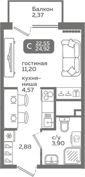22 м² · Этаж 5 из 21