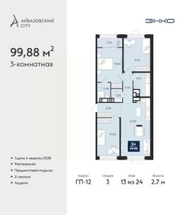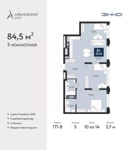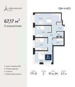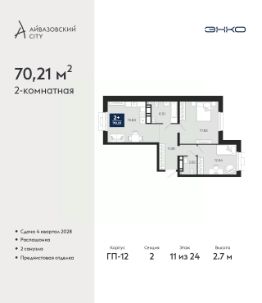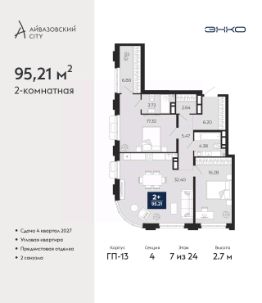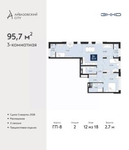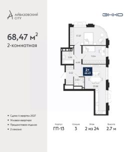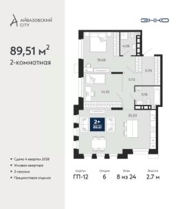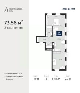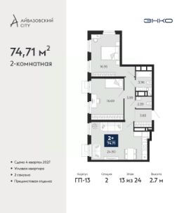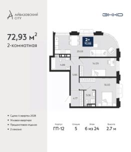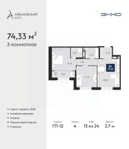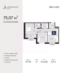 Просторная двухкомнатная квартира с предчистовой отделкой в ЖК ''Айвазовский City'' на 5 этаже. Общая площадь: 75.07 кв.м., жилая: 30.74 кв.м., площадь просторной кухни-столовой: 20.86 кв.м. Комнаты изолированные, все окна выходят на одну сторону. В квартире одна лоджия, два совмещенных санузла. Высота потолков 2.7 м. Дом монолитный, многоподъездный, высотой 24 этажа. Квартира находится в 4-й секции в корпусе ГП-12. На этаже 5 квартир. В подъезде 1 пассажирский и 1 грузовой лифт. Окончание строительства - 4 квартал 2028 года. Оформление сделки по договору долевого участия. Новый жилой район располагается в живописном месте на берегу Туры в центральной части города. Принципиально новое пространство для жизни в центре современного города для тех, чьи мечты сбываются, кто нацелен на постоянный рост, перемены к лучшему для себя и своих близких.Каждая деталь Айвазовский City вдохновляет и заряжает на новые свершения: авторская архитектура, сбалансированная продуманная инфраструктура, дизайнерские дворы со спортивными и детскими площадками, парковые зоны с фонтанами, водный канал, украшающий центральный прогулочный маршрут района и многое другое. В 2019 года проект стал лауреатом престижной премии Urban Awards 2019 в номинации ''Лучший строящийся региональный жилой комплекс бизнес-класса''. Главная особенность Айвазовский City - соседство разных архитектурных школ в рамках одного дома. Изысканная классика, выразительная эклектика и оригинальный модерн - жить в одном из таких домов настоящий повод для гордости. Айвазовский City это идеальное сочетание комфорта, технологий и развитой инфраструктуры. Вход в подъезд возможен с улицы и со двора. Отправляясь на работу или за покупками, жители могут выйти с внешней стороны дома, а для прогулки с ребенком со стороны двора. Экологически чистые материалы и энергосберегающие технологии, качественное освещение общественных зон, видеонаблюдение по всей территории жилого района (в том числе в подъездах, лифтах и в подземном паркинге), закрытые дворы с доступом только для жителей Айвазовский City. Часть домов в Айвазовский City будут оснащены подземным паркингом. Востребованный в нашем климатическом поясе формат хранения автомобилей защитит собственность владельца в любое время года. Аккредитация в банках: ПАО Банк ''ВТБ'', ПАО ''Газпромбанк'', ОАО ''Альфа-Банк'', ''Сбербанк России'', ПАО ''Совкомбанк'' и других. #Z6vaZu