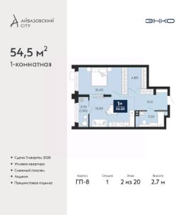 Торопитесь оформить бронирование по этой цене! Срок акции ограничен! Стоимость квартиры указана со скидкой, ваша экономия составит 457,750 RUB. Информация по телефону, мы вам все подробно расскажем! Продается однокомнатная квартира от застройщика с предчистовой отделкой в ЖК ''Айвазовский City'' на 2 этаже. Общая площадь: 54.5 кв.м., жилая: 17.4 кв.м., площадь просторной кухни-столовой: 21.2 кв.м. Квартира угловая, идеально подойдет любителям тишины и панорамных видов. В квартире одна лоджия, один совмещенный санузел. Высота потолков 2.7 м. Дом монолитный, многоподъездный, переменной этажности, от 14 до 24 этажей. Квартира находится в 1-й секции высотой 20 этажей в корпусе ГП-8. На этаже 6 квартир. В подъезде 1 пассажирский и 1 грузовой лифт. Окончание строительства - 3 квартал 2026 года. Оформление сделки по договору долевого участия. Новый жилой район располагается в живописном месте на берегу Туры в центральной части города. Принципиально новое пространство для жизни в центре современного города для тех, чьи мечты сбываются, кто нацелен на постоянный рост, перемены к лучшему для себя и своих близких.Каждая деталь Айвазовский City вдохновляет и заряжает на новые свершения: авторская архитектура, сбалансированная продуманная инфраструктура, дизайнерские дворы со спортивными и детскими площадками, парковые зоны с фонтанами, водный канал, украшающий центральный прогулочный маршрут района и многое другое. В 2019 года проект стал лауреатом престижной премии Urban Awards 2019 в номинации ''Лучший строящийся региональный жилой комплекс бизнес-класса''. Главная особенность Айвазовский City - соседство разных архитектурных школ в рамках одного дома. Изысканная классика, выразительная эклектика и оригинальный модерн - жить в одном из таких домов настоящий повод для гордости. Айвазовский City это идеальное сочетание комфорта, технологий и развитой инфраструктуры. Вход в подъезд возможен с улицы и со двора. Отправляясь на работу или за покупками, жители могут выйти с внешней стороны дома, а для прогулки с ребенком со стороны двора. Экологически чистые материалы и энергосберегающие технологии, качественное освещение общественных зон, видеонаблюдение по всей территории жилого района (в том числе в подъездах, лифтах и в подземном паркинге), закрытые дворы с доступом только для жителей Айвазовский City. Часть домов в Айвазовский City будут оснащены подземным паркингом. Востребованный в нашем климатическом поясе формат хранения автомобилей защитит собственность владельца в любое время года. Аккредитация в банках: ОАО ''Альфа-Банк'', ПАО ''Газпромбанк'', ПАО Банк ''ВТБ'', ''Сбербанк России'', ПАО ''Совкомбанк'' и других. #z5FmB4