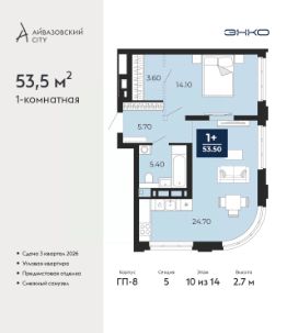Торопитесь забронировать на этих условиях! Предложение ограничено! Стоимость квартиры указана со скидкой, ваша экономия составит 600,000 RUB. Звоните, мы вам все подробно расскажем! Однокомнатная квартира с предчистовой отделкой в ЖК ''Айвазовский City'' на 10 этаже. Общая площадь: 53.5 кв.м., жилая: 14.1 кв.м., площадь просторной кухни-столовой: 24.7 кв.м. Угловая квартира, очень светлая, естественная вентиляция при открытии окон. В квартире один совмещенный санузел. Высота потолков 2.7 м. Дом монолитный, многоподъездный, переменной этажности, от 14 до 24 этажей. Квартира находится в 5-й секции высотой 14 этажей в корпусе ГП-8. На этаже 5 квартир. В подъезде 1 пассажирский и 1 грузовой лифт. Окончание строительства - 3 квартал 2026 года. Оформление сделки по договору долевого участия. Новый жилой район располагается в живописном месте на берегу Туры в центральной части города. Принципиально новое пространство для жизни в центре современного города для тех, чьи мечты сбываются, кто нацелен на постоянный рост, перемены к лучшему для себя и своих близких.Каждая деталь Айвазовский City вдохновляет и заряжает на новые свершения: авторская архитектура, сбалансированная продуманная инфраструктура, дизайнерские дворы со спортивными и детскими площадками, парковые зоны с фонтанами, водный канал, украшающий центральный прогулочный маршрут района и многое другое. В 2019 года проект стал лауреатом престижной премии Urban Awards 2019 в номинации ''Лучший строящийся региональный жилой комплекс бизнес-класса''. Главная особенность Айвазовский City - соседство разных архитектурных школ в рамках одного дома. Изысканная классика, выразительная эклектика и оригинальный модерн - жить в одном из таких домов настоящий повод для гордости. Айвазовский City это идеальное сочетание комфорта, технологий и развитой инфраструктуры. Вход в подъезд возможен с улицы и со двора. Отправляясь на работу или за покупками, жители могут выйти с внешней стороны дома, а для прогулки с ребенком со стороны двора. Экологически чистые материалы и энергосберегающие технологии, качественное освещение общественных зон, видеонаблюдение по всей территории жилого района (в том числе в подъездах, лифтах и в подземном паркинге), закрытые дворы с доступом только для жителей Айвазовский City. Часть домов в Айвазовский City будут оснащены подземным паркингом. Востребованный в нашем климатическом поясе формат хранения автомобилей защитит собственность владельца в любое время года. Аккредитация в банках: ОАО ''Альфа-Банк'', ПАО Банк ''ВТБ'', ''Сбербанк России'', ПАО ''Газпромбанк'', АО ''ДОМ.РФ'' и других. #ZMvdsu