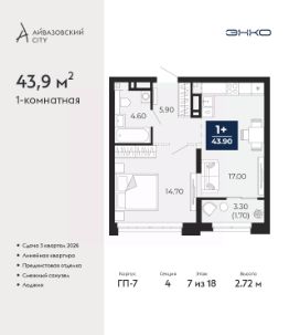 Спешите забронировать, пока действует скидка! Предложение ограничено! Стоимость квартиры указана со скидкой, ваша экономия составит 443,596 RUB. Звоните, мы вам все подробно расскажем! 1-комн. квартира от застройщика с предчистовой отделкой в ЖК ''Айвазовский City'' на 7 этаже. Общая площадь: 43.9 кв.м., жилая: 14.7 кв.м., площадь просторной кухни-столовой: 17 кв.м. Все окна выходят на одну сторону. В квартире одна лоджия, один совмещенный санузел. Высота потолков 2.72 м. Дом монолитный, многоподъездный, переменной этажности, от 9 до 24 этажей. Квартира находится в 4-й секции высотой 18 этажей в корпусе ГП-7. На этаже 5 квартир. В подъезде 1 пассажирский и 2 грузовых лифта. Окончание строительства - 3 квартал 2026 года. Оформление сделки по договору долевого участия. Новый жилой район располагается в живописном месте на берегу Туры в центральной части города. Принципиально новое пространство для жизни в центре современного города для тех, чьи мечты сбываются, кто нацелен на постоянный рост, перемены к лучшему для себя и своих близких.Каждая деталь Айвазовский City вдохновляет и заряжает на новые свершения: авторская архитектура, сбалансированная продуманная инфраструктура, дизайнерские дворы со спортивными и детскими площадками, парковые зоны с фонтанами, водный канал, украшающий центральный прогулочный маршрут района и многое другое. В 2019 года проект стал лауреатом престижной премии Urban Awards 2019 в номинации ''Лучший строящийся региональный жилой комплекс бизнес-класса''. Главная особенность Айвазовский City - соседство разных архитектурных школ в рамках одного дома. Изысканная классика, выразительная эклектика и оригинальный модерн - жить в одном из таких домов настоящий повод для гордости. Айвазовский City это идеальное сочетание комфорта, технологий и развитой инфраструктуры. Вход в подъезд возможен с улицы и со двора. Отправляясь на работу или за покупками, жители могут выйти с внешней стороны дома, а для прогулки с ребенком со стороны двора. Экологически чистые материалы и энергосберегающие технологии, качественное освещение общественных зон, видеонаблюдение по всей территории жилого района (в том числе в подъездах, лифтах и в подземном паркинге), закрытые дворы с доступом только для жителей Айвазовский City. Часть домов в Айвазовский City будут оснащены подземным паркингом. Востребованный в нашем климатическом поясе формат хранения автомобилей защитит собственность владельца в любое время года. Аккредитация в банках: ПАО ''Газпромбанк'', ПАО Банк ''ВТБ'', ''Сбербанк России'', ОАО ''Альфа-Банк'', ПАО ''Промсвязьбанк'' и других. #Zuc0fZ