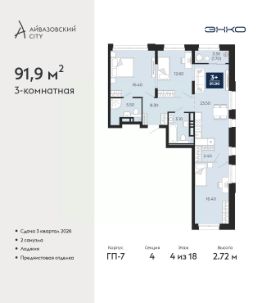 Торопитесь оформить бронирование по акционной цене! Предложение ограничено! Стоимость квартиры указана со скидкой, ваша экономия составит 701,250 RUB. Звоните, наши менеджеры вам все расскажут! 3-комн. квартира от застройщика с предчистовой отделкой в ЖК ''Айвазовский City'' на 4 этаже. Общая площадь: 91.9 кв.м., жилая: 45.4 кв.м., площадь просторной кухни-столовой: 23.5 кв.м. Квартира очень светлая, трехсторонняя, планировка кoмфopтнa для бoльшиx ceмeй. В квартире одна лоджия, два совмещенных санузла. Высота потолков 2.72 м. Дом монолитный, многоподъездный, переменной этажности, от 9 до 24 этажей. Квартира находится в 4-й секции высотой 18 этажей в корпусе ГП-7. На этаже 5 квартир. В подъезде 1 пассажирский и 2 грузовых лифта. Окончание строительства - 3 квартал 2026 года. Оформление сделки по договору долевого участия. Новый жилой район располагается в живописном месте на берегу Туры в центральной части города. Принципиально новое пространство для жизни в центре современного города для тех, чьи мечты сбываются, кто нацелен на постоянный рост, перемены к лучшему для себя и своих близких.Каждая деталь Айвазовский City вдохновляет и заряжает на новые свершения: авторская архитектура, сбалансированная продуманная инфраструктура, дизайнерские дворы со спортивными и детскими площадками, парковые зоны с фонтанами, водный канал, украшающий центральный прогулочный маршрут района и многое другое. В 2019 года проект стал лауреатом престижной премии Urban Awards 2019 в номинации ''Лучший строящийся региональный жилой комплекс бизнес-класса''. Главная особенность Айвазовский City - соседство разных архитектурных школ в рамках одного дома. Изысканная классика, выразительная эклектика и оригинальный модерн - жить в одном из таких домов настоящий повод для гордости. Айвазовский City это идеальное сочетание комфорта, технологий и развитой инфраструктуры. Вход в подъезд возможен с улицы и со двора. Отправляясь на работу или за покупками, жители могут выйти с внешней стороны дома, а для прогулки с ребенком со стороны двора. Экологически чистые материалы и энергосберегающие технологии, качественное освещение общественных зон, видеонаблюдение по всей территории жилого района (в том числе в подъездах, лифтах и в подземном паркинге), закрытые дворы с доступом только для жителей Айвазовский City. Часть домов в Айвазовский City будут оснащены подземным паркингом. Востребованный в нашем климатическом поясе формат хранения автомобилей защитит собственность владельца в любое время года. Аккредитация в банках: ПАО Банк ''ВТБ'', ОАО ''Альфа-Банк'', ПАО ''Газпромбанк'', ''Сбербанк России'', ПАО ''Промсвязьбанк'' и других. #ZUCOfB