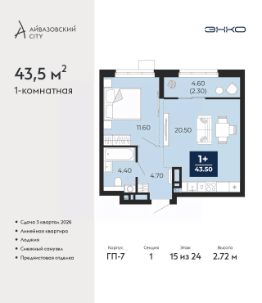Спешите забронировать по этой цене! Предложение ограничено! Стоимость квартиры указана со скидкой, ваша экономия составит 462,596 RUB. Звоните, мы вам все подробно расскажем! Однокомнатная квартира от застройщика с предчистовой отделкой в ЖК ''Айвазовский City'' на 15 этаже. Общая площадь: 43.5 кв.м., жилая: 11.6 кв.м., площадь просторной кухни-столовой: 20.5 кв.м. Все окна выходят на одну сторону. В квартире одна лоджия, один совмещенный санузел. Высота потолков 2.72 м. Дом монолитный, многоподъездный, переменной этажности, от 9 до 24 этажей. Квартира находится в 1-й секции высотой 24 этажа в корпусе ГП-7. На этаже 6 квартир. В подъезде 1 пассажирский и 2 грузовых лифта. Окончание строительства - 3 квартал 2026 года. Оформление сделки по договору долевого участия. Новый жилой район располагается в живописном месте на берегу Туры в центральной части города. Принципиально новое пространство для жизни в центре современного города для тех, чьи мечты сбываются, кто нацелен на постоянный рост, перемены к лучшему для себя и своих близких.Каждая деталь Айвазовский City вдохновляет и заряжает на новые свершения: авторская архитектура, сбалансированная продуманная инфраструктура, дизайнерские дворы со спортивными и детскими площадками, парковые зоны с фонтанами, водный канал, украшающий центральный прогулочный маршрут района и многое другое. В 2019 года проект стал лауреатом престижной премии Urban Awards 2019 в номинации ''Лучший строящийся региональный жилой комплекс бизнес-класса''. Главная особенность Айвазовский City - соседство разных архитектурных школ в рамках одного дома. Изысканная классика, выразительная эклектика и оригинальный модерн - жить в одном из таких домов настоящий повод для гордости. Айвазовский City это идеальное сочетание комфорта, технологий и развитой инфраструктуры. Вход в подъезд возможен с улицы и со двора. Отправляясь на работу или за покупками, жители могут выйти с внешней стороны дома, а для прогулки с ребенком со стороны двора. Экологически чистые материалы и энергосберегающие технологии, качественное освещение общественных зон, видеонаблюдение по всей территории жилого района (в том числе в подъездах, лифтах и в подземном паркинге), закрытые дворы с доступом только для жителей Айвазовский City. Часть домов в Айвазовский City будут оснащены подземным паркингом. Востребованный в нашем климатическом поясе формат хранения автомобилей защитит собственность владельца в любое время года. Аккредитация в банках: ОАО ''Альфа-Банк'', ПАО ''Газпромбанк'', ПАО Банк ''ВТБ'', ''Сбербанк России'', ПАО АКБ ''Абсолют Банк'' и других. #25EsmB