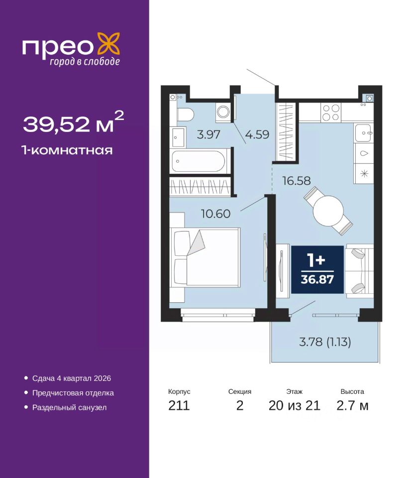 Торопитесь оформить бронирование на этих условиях, предложение ограничено! Стоимость квартиры указана со скидкой, ваша экономия составит 293,250 руб. Информация по телефону, мы вам все подробно расскажем. 1-комн. квартира с предчистовой отделкой в ЖК ''Прео'' на 20 этаже. Общая площадь: 39.52 кв.м. Высота потолков 2.7 м. Дом монолитный, черырехподъездный, переменной этажности, от 14 до 21 этажей. Квартира находится во 2-й секции высотой 21 этаж в корпусе 211. На этаже 10 квартир. В подъезде 1 пассажирский и 1 грузовой лифт. Окончание строительства - 4 квартал 2026 года. Оформление сделки по договору долевого участия. Преображенский — один из самых привлекательных районов для жизни! Это полностью самостоятельный жилой район с точки зрения инфраструктуры. Преображенский находится между Московским и Червишевским трактами в квартале улиц Закалужская — Вьюжная — Александра Протозанова. Не нужно ждать, когда появится инфраструктура — переезжайте на всё готовое. Вблизи расположены действующие школа и детский сад. В этом году откроется еще один сад, а в следующем году — школа. По соседству с Преображенским запланировано строительство городского парка ''Комарово'' площадью 38 гектар. За 10 минут можно доехать на автомобиле до крупных ТРЦ: ''Лента'', ''Кристалл'', ''Леруа Мерлен'', ''Метро'' и ''Ашан''. С 2018 года в районе открыт Соседский центр — пространство, созданное для формирования добрососедской среды, совместного досуга, общения и реализации соседских инициатив. Здесь проходят встречи соседей, а также сами жители района организовывают мероприятия. Организатором такого события может стать любой желающий. В квартирах выполнена качественная предчистовая отделка. Гладкие стены с финишным выравниванием по маякам. Ровный потолок для установки натяжного потолка. Установлены пятикамерные окна с двойным стеклопакетом (3 стекла). Дизайнерские холлы с видеонаблюдением, безбарьерным и прозрачным входом всегда светло и спокойно. На первом этаже есть просторные колясочные, где все жители могут оставлять свои коляски и велосипеды. В Преображенском есть всё, что нужно для активного отдыха и занятий спортом. Мы сделали большое футбольное поле с безопасным покрытием. Также установили хоккейный корт, который оборудован по всем необходимым стандартам. Во дворах можно делать упражнения на специальных площадках с турниками. Весь район мы обустроили велодорожками, которые связаны в единый маршрут. У нас есть сухие фонтаны, бьющие из земли, деревья, веревки, сетки, скалодром, газон, песок и резинка — осталось просто дать своему ребенку право на свободную игру. По-настоящему хорошие дворы — это те, которые дети предпочитают соцсетям и телевизору. Аккредитация в банках: ПАО ''Газпромбанк'', ''Сбербанк России'', ПАО ''Банк Уралсиб'', ПАО Банк ''ВТБ'', ОАО ''Альфа-Банк'' и других. #z6E2ag