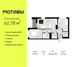 Продается двухкомнатная квартира с предчистовой отделкой в ЖК ''Мотивы'' на 10 этаже. Общая площадь: 62.78 кв.м., жилая: 23.91 кв.м., площадь просторной кухни-столовой: 18.93 кв.м. Квартира угловая, окна oбecпeчивaют paвнoмepнoe ocвeщeниe в тeчeниe дня. В квартире одна лоджия, два совмещенных санузла. Высота потолков 2.7 м. Квартира будет сдаваться с предчистовой отделкой White Box: выровнены и оштукатурены стены, проведено электричество и отопление, установлены радиаторы. Вы также можете приобрести квартиру с ремонтом от застройщика, представленным в трех цветовых решениях Scandi, Wood и Coffee и включающим ламинат, обои под покраску, двери, натяжной потолок и санузел с сантехникой. При желании вы можете заказать отделку под ключ, варианты возможных решений представлены в альбоме фотографий. Дом монолитный, трехподъездный, высотой 10 этажей. Квартира находится в 3-й секции в корпусе ГП-7. На этаже 5 квартир. В подъезде 1 пассажирский и 1 грузовой лифт. Окончание строительства - 2 квартал 2026 года. Оформление сделки по договору долевого участия. Закрытая от автомобилей территория, безопасный двор и камеры видеонаблюдения - гаранты вашего спокойствия. Квартал будет располагать богатой инфраструктурой: на первых этажах разместятся магазины, пекарни, кофейни, пункты выдачи, аптеки, детские центры, цветочные салоны и многое другое, что сделает жизнь поистине комфортной. Рядом находится парк общей площадью почти 5000 м², в котором располагаются локации для игр и отдыха жителей, здесь можно совершить утреннюю пробежку или прогуляться после рабочего дня. В парке есть зона воркаута с тренажерами для взрослых, игровые комплексы с горками и канатный комплекс для детей разных возрастов, качели и лавочки для отдыха, площадки для командных видов спорта и для панна-футбола. В ЖК ''Мотивы'' всё продумано до мелочей: светлые холлы входных групп, оформленные в едином стиле, просторные колясочные, лапомойки для питомцев. На территории комплекса находятся 2 8-ми этажных паркинга и более 1000 м/м на открытой парковке. Жилой комплекс находится в одном из экологически благоприятных районов Тюмени, недалеко от Плехановского бора. При этом до центра города можно добраться за 15 минут, а до международного аэропорта Рощино за 13 минут. Окончание строительства: ГП 1, 2, 3, 4 сдача до конца 2024 года, ГП 6, 7, 8 сдача 2 квартал 2026 года. #2WDdDb