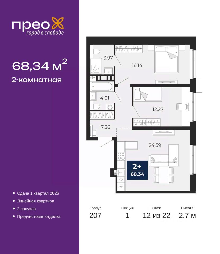 Спешите оформить бронирование по этой цене, срок акции ограничен! Стоимость квартиры указана со скидкой, ваша экономия составит 500,000 руб. Звоните, наши менеджеры вам все расскажут. Просторная 2-комн. квартира с предчистовой отделкой в ЖК ''Прео'' на 12 этаже. Общая площадь: 68.34 кв.м., жилая: 28.41 кв.м., площадь просторной кухни-столовой: 24.59 кв.м. Комнаты изолированные, все окна выходят на одну сторону. В квартире два совмещенных санузла. Высота потолков 2.7 м. Дом монолитный, двухподъездный, высотой 22 этажа. Квартира находится в 1-й секции в корпусе 207. На этаже 8 квартир. В подъезде 1 пассажирский и 1 грузовой лифт. Окончание строительства - 1 квартал 2026 года. Оформление сделки по договору долевого участия. Преображенский — один из самых привлекательных районов для жизни! Это полностью самостоятельный жилой район с точки зрения инфраструктуры. Преображенский находится между Московским и Червишевским трактами в квартале улиц Закалужская — Вьюжная — Александра Протозанова. Не нужно ждать, когда появится инфраструктура — переезжайте на всё готовое. Вблизи расположены действующие школа и детский сад. В этом году откроется еще один сад, а в следующем году — школа. По соседству с Преображенским запланировано строительство городского парка ''Комарово'' площадью 38 гектар. За 10 минут можно доехать на автомобиле до крупных ТРЦ: ''Лента'', ''Кристалл'', ''Леруа Мерлен'', ''Метро'' и ''Ашан''. С 2018 года в районе открыт Соседский центр — пространство, созданное для формирования добрососедской среды, совместного досуга, общения и реализации соседских инициатив. Здесь проходят встречи соседей, а также сами жители района организовывают мероприятия. Организатором такого события может стать любой желающий. В квартирах выполнена качественная предчистовая отделка. Гладкие стены с финишным выравниванием по маякам. Ровный потолок для установки натяжного потолка. Установлены пятикамерные окна с двойным стеклопакетом (3 стекла). Дизайнерские холлы с видеонаблюдением, безбарьерным и прозрачным входом всегда светло и спокойно. На первом этаже есть просторные колясочные, где все жители могут оставлять свои коляски и велосипеды. В Преображенском есть всё, что нужно для активного отдыха и занятий спортом. Мы сделали большое футбольное поле с безопасным покрытием. Также установили хоккейный корт, который оборудован по всем необходимым стандартам. Во дворах можно делать упражнения на специальных площадках с турниками. Весь район мы обустроили велодорожками, которые связаны в единый маршрут. У нас есть сухие фонтаны, бьющие из земли, деревья, веревки, сетки, скалодром, газон, песок и резинка — осталось просто дать своему ребенку право на свободную игру. По-настоящему хорошие дворы — это те, которые дети предпочитают соцсетям и телевизору. Аккредитация в банках: ПАО Банк ''ВТБ'', ''Сбербанк России'', ПАО ''Газпромбанк'', ОАО ''Альфа-Банк'', ПАО ''Банк Уралсиб'' и других. #z6D6Tu