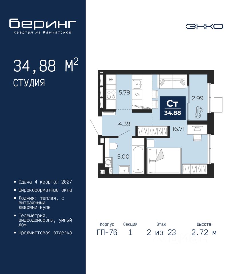 Торопитесь забронировать, пока действует скидка, предложение ограничено! Стоимость квартиры указана со скидкой, ваша экономия составит 248,114 руб. Звоните, наши менеджеры вам все расскажут. Однокомнатная квартира-студия от застройщика с предчистовой отделкой в ЖК ''Беринг'' на 2 этаже. Общая площадь: 34.88 кв.м., площадь гостиной 22.5 кв.м., из которых 5.79 кв.м. выделено под кухонную зону. Все окна выходят на одну сторону. В квартире одна лоджия, один совмещенный санузел. Высота потолков 2.72 м. Дом монолитный, черырехподъездный, переменной этажности, от 19 до 24 этажей. Квартира находится в 1-й секции высотой 23 этажа в корпусе ГП-76. На этаже 7 квартир. В подъезде 2 пассажирских и 1 грузовой лифт. Окончание строительства - 4 квартал 2027 года. Оформление сделки по договору долевого участия. Подобно знаменитому исследователю, мы чувствуем себя первооткрывателями этой локации. Хотим показать новую суть места, сформировать для вас жизненный опыт, которого ещё не было. Беринг — район зелёного цвета. Беринг — район, который откроется вам с другой стороны. Впечатлит новым уровнем комфорта и качеством жизни. Беринг — открытие на карте города. Первый квартал расположен в районе Тура, в границах улиц: Камчатская Западносибирская Энтузиастов. Вокруг уже есть всё для того, чтобы ежедневная рутина была лишь частью жизни и не доставляла дискомфорта. Школы и детские сады, магазины и аптеки, поликлиника, места для семейного отдыха, пеших и велопрогулок, и даже рыбалки. Масштабное озеленение дворов — визитная карточка ЭНКО и ваш оазис спокойствия, чтобы отвлечься от повседневности. Раскидистые деревья, кустарники, травы и цветы — осталось остановиться, вдохнуть и расслабиться, глядя на эту природную красоту. Стилистика подъездов продолжает концепцию Беринга, вдохновлённого Камчаткой: сдержанный, но при этом впечатляющий дизайн соседствует с удобством и функциональностью. #z66Bbg