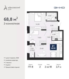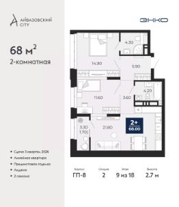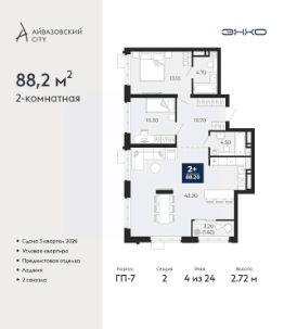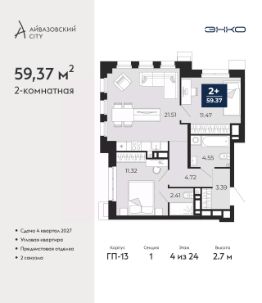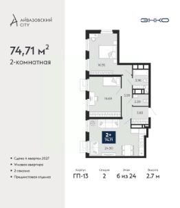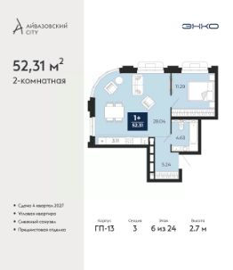 Торопитесь забронировать, пока действует скидка! Предложение ограничено! Стоимость квартиры указана со скидкой, ваша экономия составит 542,100 RUB. Звоните, наши менеджеры вам все расскажут! 2-комн. квартира с предчистовой отделкой в ЖК ''Айвазовский City'' на 12 этаже. Общая площадь: 62.48 кв.м., жилая: 24.29 кв.м., площадь просторной кухни-столовой: 16.28 кв.м. Квартира угловая, очень светлая, естественная вентиляция при открытии окон. В квартире одна лоджия, один совмещенный и один раздельный санузел. Высота потолков 2.7 м. Дом монолитный, многоподъездный, высотой 24 этажа. Квартира находится во 2-й секции в корпусе ГП-13. На этаже 6 квартир. В подъезде 1 пассажирский и 1 грузовой лифт. Окончание строительства - 4 квартал 2027 года. Оформление сделки по договору долевого участия. Новый жилой район располагается в живописном месте на берегу Туры в центральной части города. Принципиально новое пространство для жизни в центре современного города для тех, чьи мечты сбываются, кто нацелен на постоянный рост, перемены к лучшему для себя и своих близких.Каждая деталь Айвазовский City вдохновляет и заряжает на новые свершения: авторская архитектура, сбалансированная продуманная инфраструктура, дизайнерские дворы со спортивными и детскими площадками, парковые зоны с фонтанами, водный канал, украшающий центральный прогулочный маршрут района и многое другое. В 2019 года проект стал лауреатом престижной премии Urban Awards 2019 в номинации ''Лучший строящийся региональный жилой комплекс бизнес-класса''. Главная особенность Айвазовский City - соседство разных архитектурных школ в рамках одного дома. Изысканная классика, выразительная эклектика и оригинальный модерн - жить в одном из таких домов настоящий повод для гордости. Айвазовский City это идеальное сочетание комфорта, технологий и развитой инфраструктуры. Вход в подъезд возможен с улицы и со двора. Отправляясь на работу или за покупками, жители могут выйти с внешней стороны дома, а для прогулки с ребенком со стороны двора. Экологически чистые материалы и энергосберегающие технологии, качественное освещение общественных зон, видеонаблюдение по всей территории жилого района (в том числе в подъездах, лифтах и в подземном паркинге), закрытые дворы с доступом только для жителей Айвазовский City. Часть домов в Айвазовский City будут оснащены подземным паркингом. Востребованный в нашем климатическом поясе формат хранения автомобилей защитит собственность владельца в любое время года. Аккредитация в банках: ПАО ''Газпромбанк'', ''Сбербанк России'', ОАО ''Альфа-Банк'', ПАО Банк ''ВТБ'', ПАО АКБ ''Абсолют Банк'' и других. #2mBwU6