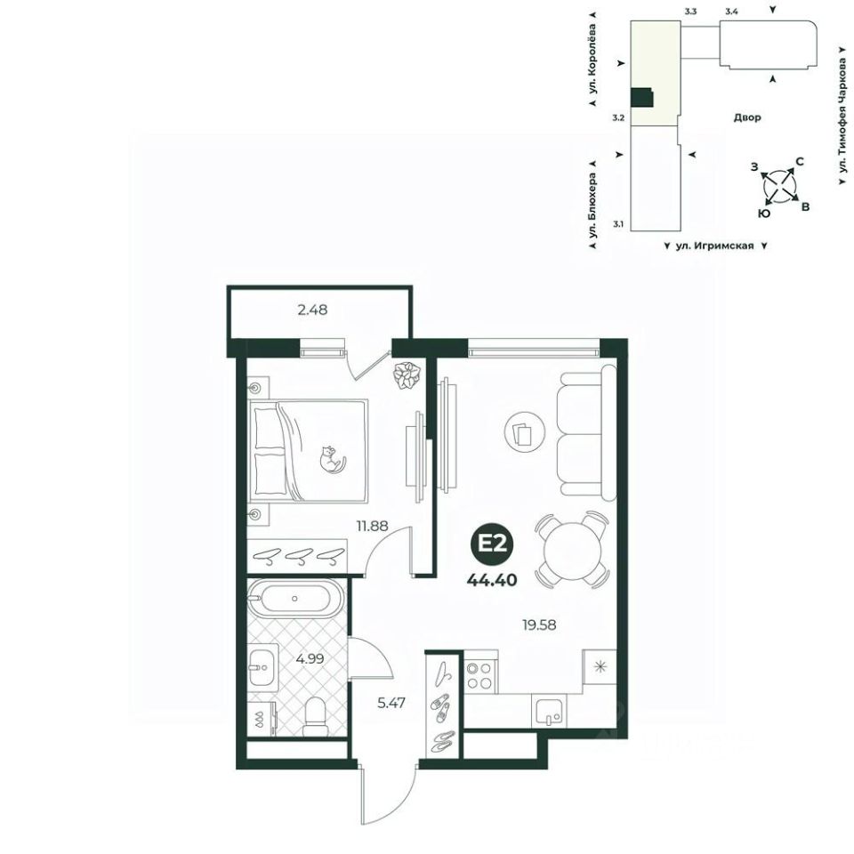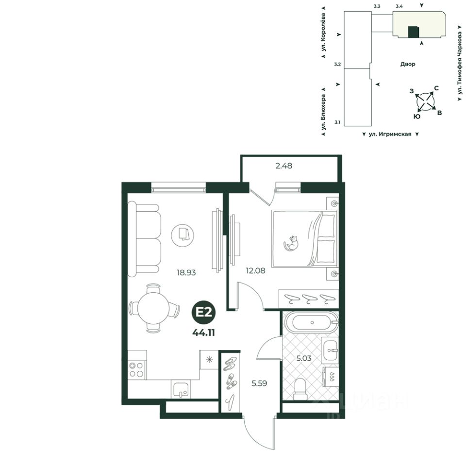 Евродвухкомнатная квартира с выходом на балкон из спальни. Просторная кухня-гостиная - идеальное пространство для комфортной жизни и времяпрепровождения с близкими. Из комнаты можно выйти на балкон. В прихожей есть ниша под шкаф. Санузел совмещенный, его площадь позволяет установить стиральную машину.