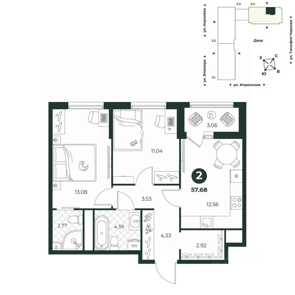 Евродвухкомнатная квартира с просторной кухней-гостиной, для создания комфортной атмосферы совместного времяпрепровождения с семьей. Из комнаты можно выйти на французский балкон с видом на двор. В прихожей есть ниша под шкаф. Площадь санузла подволяет установить стиральную машину.
