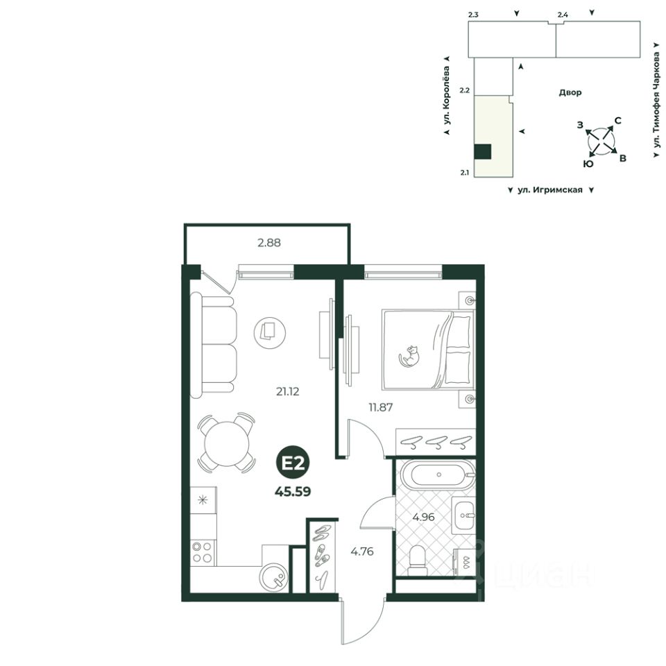 Евродвухкомнатная квартира с выходом на французский балкон из спальни. Просторная кухня-гостиная идеально подходит для размещения семейного обеденного стола и детской игровой зоны. В прихожей достаточно места для расположения шкафа. Санузел совмещенный. Окна выходят во двор.