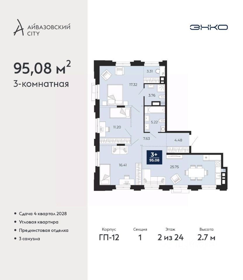 Продается 3-комн. квартира с предчистовой отделкой в ЖК ''Айвазовский City'' на 2 этаже. Общая площадь: 95.08 кв.м., жилая: 42.51 кв.м., площадь просторной кухни-столовой: 35.2 кв.м. Квартира угловая, окна oбecпeчивaют paвнoмepнoe ocвeщeниe в тeчeниe дня. В квартире два совмещенных и один раздельный санузел. Высота потолков 2.7 м. Дом монолитный, многоподъездный, высотой 24 этажа. Квартира находится в 1-й секции в корпусе ГП-12. На этаже 7 квартир. В подъезде 2 пассажирских и 1 грузовой лифт. Окончание строительства - 4 квартал 2028 года. Оформление сделки по договору долевого участия. Новый жилой район располагается в живописном месте на берегу Туры в центральной части города. Принципиально новое пространство для жизни в центре современного города для тех, чьи мечты сбываются, кто нацелен на постоянный рост, перемены к лучшему для себя и своих близких. Каждая деталь Айвазовский City вдохновляет и заряжает на новые свершения: авторская архитектура, сбалансированная продуманная инфраструктура, дизайнерские дворы со спортивными и детскими площадками, парковые зоны с фонтанами, водный канал, украшающий центральный прогулочный маршрут района и многое другое. В 2019 года проект стал лауреатом престижной премии Urban Awards 2019 в номинации ''Лучший строящийся региональный жилой комплекс бизнес-класса''. Главная особенность Айвазовский City - соседство разных архитектурных школ в рамках одного дома. Изысканная классика, выразительная эклектика и оригинальный модерн - жить в одном из таких домов настоящий повод для гордости. Айвазовский City это идеальное сочетание комфорта, технологий и развитой инфраструктуры. Вход в подъезд возможен с улицы и со двора. Отправляясь на работу или за покупками, жители могут выйти с внешней стороны дома, а для прогулки с ребенком со стороны двора. Экологически чистые материалы и энергосберегающие технологии, качественное освещение общественных зон, видеонаблюдение по всей территории жилого района (в том числе в подъездах, лифтах и в подземном паркинге), закрытые дворы с доступом только для жителей Айвазовский City. Часть домов в Айвазовский City будут оснащены подземным паркингом. Востребованный в нашем климатическом поясе формат хранения автомобилей защитит собственность владельца в любое время года. Аккредитация в банках: ПАО ''Газпромбанк'', ОАО ''Альфа-Банк'', ''Сбербанк России'', ПАО Банк ''ВТБ'', ПАО Банк ''ФК Открытие'' и других. #z6tmcA
