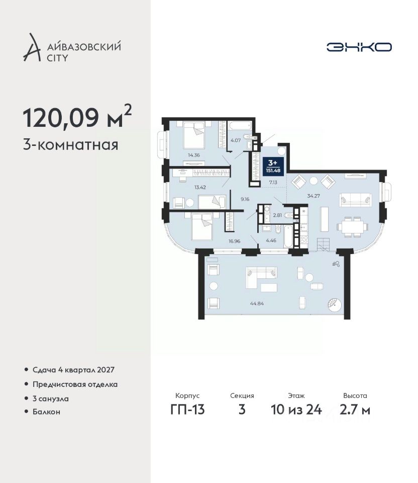 3-комн. квартира от застройщика с предчистовой отделкой в ЖК ''Айвазовский City'' на 10 этаже. Общая площадь: 120.09 кв.м., жилая: 44.74 кв.м., площадь просторной кухни-столовой: 34.27 кв.м. Квартира без проходных комнат, окна выходят нa три cтopoны дома. В квартире один балкон, два совмещенных и один раздельный санузел. Наличие в квартире террасы дает возможность для создания зон отдыха в кругу семьи и друзей. Высота потолков 2.7 м. Дом монолитный, многоподъездный, высотой 24 этажа. Квартира находится в 3-й секции в корпусе ГП-13. На этаже 9 квартир. В подъезде 1 пассажирский и 1 грузовой лифт. Окончание строительства - 4 квартал 2027 года. Оформление сделки по договору долевого участия. Новый жилой район располагается в живописном месте на берегу Туры в центральной части города. Принципиально новое пространство для жизни в центре современного города для тех, чьи мечты сбываются, кто нацелен на постоянный рост, перемены к лучшему для себя и своих близких. Каждая деталь Айвазовский City вдохновляет и заряжает на новые свершения: авторская архитектура, сбалансированная продуманная инфраструктура, дизайнерские дворы со спортивными и детскими площадками, парковые зоны с фонтанами, водный канал, украшающий центральный прогулочный маршрут района и многое другое. В 2019 года проект стал лауреатом престижной премии Urban Awards 2019 в номинации ''Лучший строящийся региональный жилой комплекс бизнес-класса''. Главная особенность Айвазовский City - соседство разных архитектурных школ в рамках одного дома. Изысканная классика, выразительная эклектика и оригинальный модерн - жить в одном из таких домов настоящий повод для гордости. Айвазовский City это идеальное сочетание комфорта, технологий и развитой инфраструктуры. Вход в подъезд возможен с улицы и со двора. Отправляясь на работу или за покупками, жители могут выйти с внешней стороны дома, а для прогулки с ребенком со стороны двора. Экологически чистые материалы и энергосберегающие технологии, качественное освещение общественных зон, видеонаблюдение по всей территории жилого района (в том числе в подъездах, лифтах и в подземном паркинге), закрытые дворы с доступом только для жителей Айвазовский City. Часть домов в Айвазовский City будут оснащены подземным паркингом. Востребованный в нашем климатическом поясе формат хранения автомобилей защитит собственность владельца в любое время года. Аккредитация в банках: ПАО Банк ''ВТБ'', ''Сбербанк России'', ПАО ''Газпромбанк'', ОАО ''Альфа-Банк'', ПАО ''Промсвязьбанк'' и других. #z67v5S