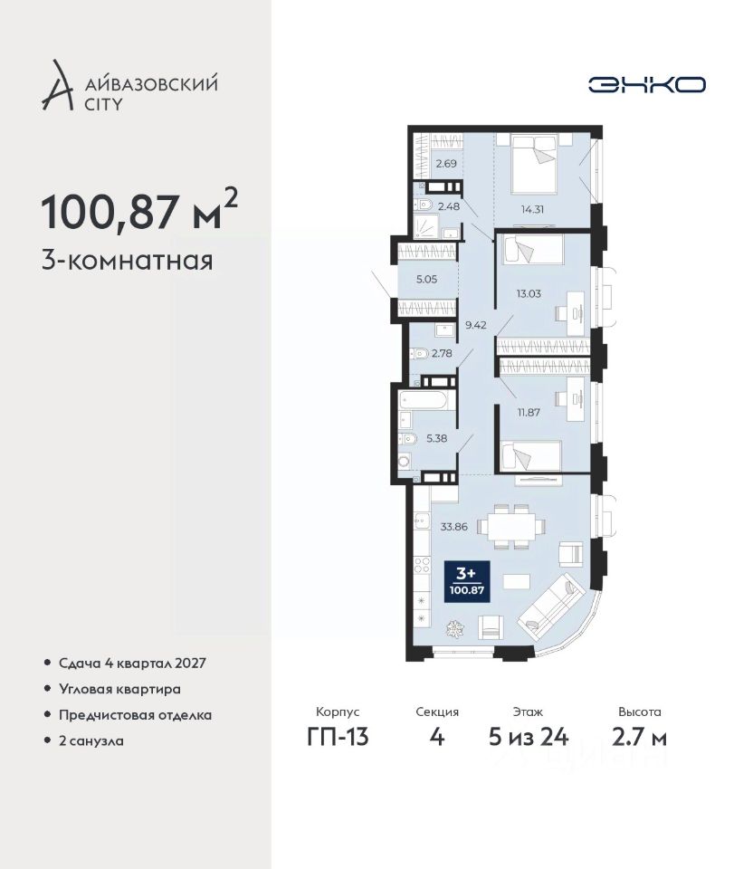 Трехкомнатная квартира с предчистовой отделкой в ЖК ''Айвазовский City'' на 4 этаже. Общая площадь: 86.69 кв.м., жилая: 46.87 кв.м., площадь просторной кухни-столовой: 19.6 кв.м. Квартира угловая, идеально подойдет любителям тишины и панорамных видов. В квартире два совмещенных санузла. Высота потолков 2.7 м. Дом монолитный, многоподъездный, высотой 24 этажа. Квартира находится в 1-й секции в корпусе ГП-13. На этаже 2 квартиры. Окончание строительства - 4 квартал 2027 года. Оформление сделки по договору долевого участия. Новый жилой район располагается в живописном месте на берегу Туры в центральной части города. Принципиально новое пространство для жизни в центре современного города для тех, чьи мечты сбываются, кто нацелен на постоянный рост, перемены к лучшему для себя и своих близких. Каждая деталь Айвазовский City вдохновляет и заряжает на новые свершения: авторская архитектура, сбалансированная продуманная инфраструктура, дизайнерские дворы со спортивными и детскими площадками, парковые зоны с фонтанами, водный канал, украшающий центральный прогулочный маршрут района и многое другое. В 2019 года проект стал лауреатом престижной премии Urban Awards 2019 в номинации ''Лучший строящийся региональный жилой комплекс бизнес-класса''. Главная особенность Айвазовский City - соседство разных архитектурных школ в рамках одного дома. Изысканная классика, выразительная эклектика и оригинальный модерн - жить в одном из таких домов настоящий повод для гордости. Айвазовский City это идеальное сочетание комфорта, технологий и развитой инфраструктуры. Вход в подъезд возможен с улицы и со двора. Отправляясь на работу или за покупками, жители могут выйти с внешней стороны дома, а для прогулки с ребенком со стороны двора. Экологически чистые материалы и энергосберегающие технологии, качественное освещение общественных зон, видеонаблюдение по всей территории жилого района (в том числе в подъездах, лифтах и в подземном паркинге), закрытые дворы с доступом только для жителей Айвазовский City. Часть домов в Айвазовский City будут оснащены подземным паркингом. Востребованный в нашем климатическом поясе формат хранения автомобилей защитит собственность владельца в любое время года. Аккредитация в банках: ''Сбербанк России'', ПАО Банк ''ВТБ'', ОАО ''Альфа-Банк'', ПАО ''Газпромбанк'', ПАО ''Совкомбанк'' и других. #zmtVue