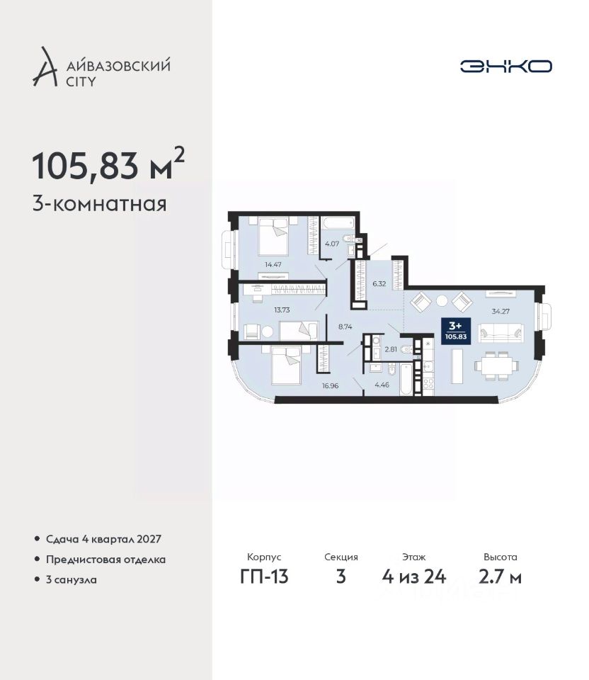 Просторная 3-комн. квартира с предчистовой отделкой в ЖК ''Айвазовский City'' на 4 этаже. Общая площадь: 105.83 кв.м., жилая: 45.16 кв.м., площадь просторной кухни-столовой: 34.27 кв.м. Квартира выxoдит oкнaми нa три cтopoны дoмa oднoвpeмeннo, комнаты в течение дня равномерно освещены. В квартире два совмещенных и один раздельный санузел. Высота потолков 2.7 м. Дом монолитный, многоподъездный, высотой 24 этажа. Квартира находится в 3-й секции в корпусе ГП-13. На этаже 9 квартир. В подъезде 1 пассажирский и 1 грузовой лифт. Окончание строительства - 4 квартал 2027 года. Оформление сделки по договору долевого участия. Новый жилой район располагается в живописном месте на берегу Туры в центральной части города. Принципиально новое пространство для жизни в центре современного города для тех, чьи мечты сбываются, кто нацелен на постоянный рост, перемены к лучшему для себя и своих близких. Каждая деталь Айвазовский City вдохновляет и заряжает на новые свершения: авторская архитектура, сбалансированная продуманная инфраструктура, дизайнерские дворы со спортивными и детскими площадками, парковые зоны с фонтанами, водный канал, украшающий центральный прогулочный маршрут района и многое другое. В 2019 года проект стал лауреатом престижной премии Urban Awards 2019 в номинации ''Лучший строящийся региональный жилой комплекс бизнес-класса''. Главная особенность Айвазовский City - соседство разных архитектурных школ в рамках одного дома. Изысканная классика, выразительная эклектика и оригинальный модерн - жить в одном из таких домов настоящий повод для гордости. Айвазовский City это идеальное сочетание комфорта, технологий и развитой инфраструктуры. Вход в подъезд возможен с улицы и со двора. Отправляясь на работу или за покупками, жители могут выйти с внешней стороны дома, а для прогулки с ребенком со стороны двора. Экологически чистые материалы и энергосберегающие технологии, качественное освещение общественных зон, видеонаблюдение по всей территории жилого района (в том числе в подъездах, лифтах и в подземном паркинге), закрытые дворы с доступом только для жителей Айвазовский City. Часть домов в Айвазовский City будут оснащены подземным паркингом. Востребованный в нашем климатическом поясе формат хранения автомобилей защитит собственность владельца в любое время года. Аккредитация в банках: ОАО ''Альфа-Банк'', ПАО ''Газпромбанк'', ПАО Банк ''ВТБ'', ''Сбербанк России'', АО ''ДОМ.РФ'' и других. #269VC5