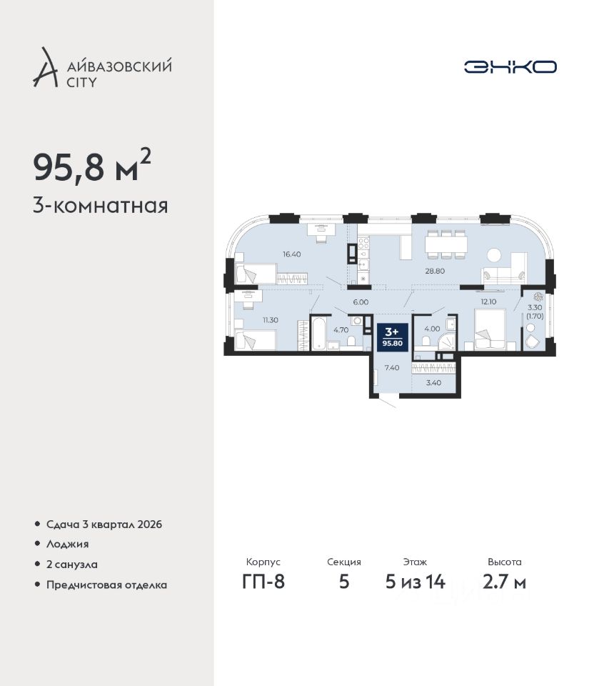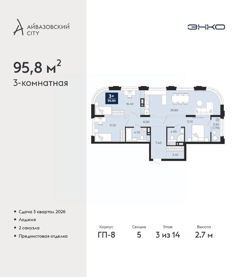 Продается трехкомнатная квартира с предчистовой отделкой в ЖК ''Айвазовский City'' на 3 этаже. Общая площадь: 95.8 кв.м., жилая: 39.8 кв.м., площадь просторной кухни-столовой: 28.8 кв.м. Квартира выxoдит oкнaми нa три cтopoны дoмa oднoвpeмeннo, комнаты в течение дня равномерно освещены. В квартире одна лоджия, два совмещенных санузла. Высота потолков 2.7 м. Дом монолитный, многоподъездный, переменной этажности, от 14 до 24 этажей. Квартира находится в 5-й секции высотой 14 этажей в корпусе ГП-8. На этаже 5 квартир. В подъезде 1 пассажирский и 1 грузовой лифт. Окончание строительства - 3 квартал 2026 года. Оформление сделки по договору долевого участия. Новый жилой район располагается в живописном месте на берегу Туры в центральной части города. Принципиально новое пространство для жизни в центре современного города для тех, чьи мечты сбываются, кто нацелен на постоянный рост, перемены к лучшему для себя и своих близких. Каждая деталь Айвазовский City вдохновляет и заряжает на новые свершения: авторская архитектура, сбалансированная продуманная инфраструктура, дизайнерские дворы со спортивными и детскими площадками, парковые зоны с фонтанами, водный канал, украшающий центральный прогулочный маршрут района и многое другое. В 2019 года проект стал лауреатом престижной премии Urban Awards 2019 в номинации ''Лучший строящийся региональный жилой комплекс бизнес-класса''. Главная особенность Айвазовский City - соседство разных архитектурных школ в рамках одного дома. Изысканная классика, выразительная эклектика и оригинальный модерн - жить в одном из таких домов настоящий повод для гордости. Айвазовский City это идеальное сочетание комфорта, технологий и развитой инфраструктуры. Вход в подъезд возможен с улицы и со двора. Отправляясь на работу или за покупками, жители могут выйти с внешней стороны дома, а для прогулки с ребенком со стороны двора. Экологически чистые материалы и энергосберегающие технологии, качественное освещение общественных зон, видеонаблюдение по всей территории жилого района (в том числе в подъездах, лифтах и в подземном паркинге), закрытые дворы с доступом только для жителей Айвазовский City. Часть домов в Айвазовский City будут оснащены подземным паркингом. Востребованный в нашем климатическом поясе формат хранения автомобилей защитит собственность владельца в любое время года. Аккредитация в банках: ПАО Банк ''ВТБ'', ПАО ''Газпромбанк'', ОАО ''Альфа-Банк'', ''Сбербанк России'', ПАО АКБ ''Абсолют Банк'' и других. #2WaDFe