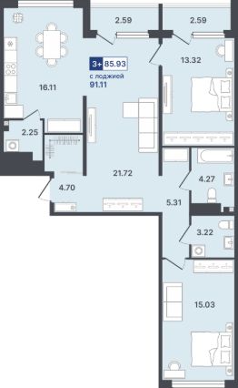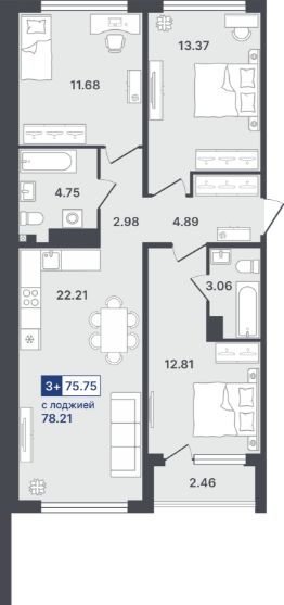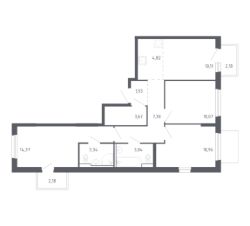 Просторная трешка с окнами на две стороны. В квартире две спальни: детская и мастер. В последней есть приватная гардеробная и санузел. В прихожей есть пространство для вместительных шкафов и дополнительного хранения.