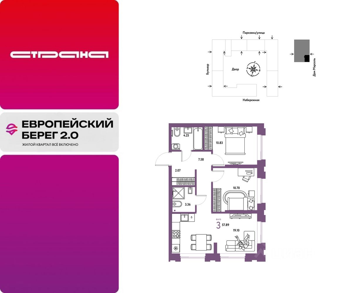 Объявление от застройщика Страна Девелопмент. Покупка квартиры защищена банком. Продается 3комнатная квартира на 20 этаже от застройщика Страна Девелопмент. Площадь квартиры 57,89 кв. м. Стоимость указана без учета акций. Европейский берег 2.0. — это продолжение легендарного жилого комплекса Европейский берег. Он включает все, что нужно для жизни, и даже больше. Этот квартал для тех, кто не готов тратить время на ненужное, жертвовать одним ради другого. Для тех, кто хочет получить все и сразу. Именно поэтому генеральная идея проекта — жилой квартал все включено. Все преимущества включены. Никаких исключений. ПРЕИМУЩЕСТВА Разнообразие планировок: от классических до квартир с мастер-спальней и террасами. Подземный паркинг с кладовыми, охраной и видеонаблюдением 24/7. Ремонт от застройщика: 5 вариантов на выбор. Закрытый двор с площадками и зонами отдыха: мост-акведук, тренажёры, лабиринты, гамаки и шезлонги. ОТДЕЛКА Базовая отделка или готовый ремонт от застройщика. В базовой отделке все черновые работы выполнены, подведены коммуникации, стены оштукатурены под маяк. В ремонт от застройщика входит 5 вариантов отделки, уже включено всё необходимое: от сантехники до кондиционера. СПОСОБЫ ПОКУПКИ Сотрудники ''Страны Девелопмент'' будут сопровождать вас на каждом этапе сделки, помогут получить одобрение по ипотеке или снизить ежемесячный платеж. - ипотека - материнский капитал - 100% оплата наличными - рассрочка - обмен — это выкуп вашей старой квартиры и зачисление полученных денежных средств в счет стоимости новой квартиры или в качестве первоначального взноса по ипотеке.