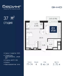 Однокомнатная квартира-студия с предчистовой отделкой в ЖК ''Беринг'' на 14 этаже. Общая площадь: 34.8 кв.м., площадь гостиной 25.22 кв.м., из которых 5 кв.м. выделено под кухонную зону. Все окна выходят на одну сторону. В квартире один балкон, один совмещенный санузел. Высота потолков 2.75 м. Дом монолитный, многоподъездный, переменной этажности, от 9 до 22 этажей. Квартира находится в 73.3-й секции высотой 16 этажей в корпусе ГП-73. На этаже 8 квартир. В подъезде 1 пассажирский и 1 грузовой лифт. Окончание строительства - 4 квартал 2025 года. Оформление сделки по договору долевого участия. Подобно знаменитому исследователю, мы чувствуем себя первооткрывателями этой локации. Хотим показать новую суть места, сформировать для вас жизненный опыт, которого ещё не было. Беринг — район зелёного цвета. Беринг — район, который откроется вам с другой стороны. Впечатлит новым уровнем комфорта и качеством жизни. Беринг — открытие на карте города. Первый квартал расположен в районе Тура, в границах улиц: Камчатская Западносибирская Энтузиастов. Вокруг уже есть всё для того, чтобы ежедневная рутина была лишь частью жизни и не доставляла дискомфорта.Школы и детские сады, магазины и аптеки, поликлиника, места для семейного отдыха, пеших и велопрогулок, и даже рыбалки. Масштабное озеленение дворов — визитная карточка ЭНКО и ваш оазис спокойствия, чтобы отвлечься от повседневности. Раскидистые деревья, кустарники, травы и цветы — осталось остановиться, вдохнуть и расслабиться, глядя на эту природную красоту. Стилистика подъездов продолжает концепцию Беринга, вдохновлённого Камчаткой: сдержанный,но при этом впечатляющий дизайн соседствует с удобством и функциональностью. #2uSSzO
