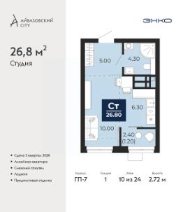 1-комн. квартира-студия от застройщика с предчистовой отделкой в ЖК ''Айвазовский City'' на 10 этаже. Общая площадь: 26.8 кв.м., площадь гостиной 17.1 кв.м., из которых 6.7 кв.м. выделено под кухонную зону. Все окна выходят на одну сторону. В квартире одна лоджия, один совмещенный санузел. Высота потолков 2.72 м. Дом монолитный, многоподъездный, переменной этажности, от 9 до 24 этажей. Квартира находится в 1-й секции высотой 24 этажа в корпусе ГП-7. На этаже 6 квартир. В подъезде 1 пассажирский и 2 грузовых лифта. Окончание строительства - 3 квартал 2026 года. Оформление сделки по договору долевого участия. Новый жилой район располагается в живописном месте на берегу Туры в центральной части города. Принципиально новое пространство для жизни в центре современного города для тех, чьи мечты сбываются, кто нацелен на постоянный рост, перемены к лучшему для себя и своих близких.Каждая деталь Айвазовский City вдохновляет и заряжает на новые свершения: авторская архитектура, сбалансированная продуманная инфраструктура, дизайнерские дворы со спортивными и детскими площадками, парковые зоны с фонтанами, водный канал, украшающий центральный прогулочный маршрут района и многое другое. В 2019 года проект стал лауреатом престижной премии Urban Awards 2019 в номинации ''Лучший строящийся региональный жилой комплекс бизнес-класса''. Главная особенность Айвазовский City - соседство разных архитектурных школ в рамках одного дома. Изысканная классика, выразительная эклектика и оригинальный модерн - жить в одном из таких домов настоящий повод для гордости. Айвазовский City это идеальное сочетание комфорта, технологий и развитой инфраструктуры. Вход в подъезд возможен с улицы и со двора. Отправляясь на работу или за покупками, жители могут выйти с внешней стороны дома, а для прогулки с ребенком со стороны двора. Экологически чистые материалы и энергосберегающие технологии, качественное освещение общественных зон, видеонаблюдение по всей территории жилого района (в том числе в подъездах, лифтах и в подземном паркинге), закрытые дворы с доступом только для жителей Айвазовский City. Часть домов в Айвазовский City будут оснащены подземным паркингом. Востребованный в нашем климатическом поясе формат хранения автомобилей защитит собственность владельца в любое время года. Аккредитация в банках: ''Сбербанк России'', ОАО ''Альфа-Банк'', ПАО ''Газпромбанк'', ПАО Банк ''ВТБ'', ПАО Банк ''ФК Открытие'' и других. #ZSEsM0