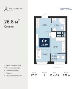 Просторная однокомнатная квартира-студия с предчистовой отделкой в ЖК ''Айвазовский City'' на 15 этаже. Общая площадь: 26.8 кв.м., площадь гостиной 17.1 кв.м., из которых 6.7 кв.м. выделено под кухонную зону. Все окна выходят на одну сторону. В квартире одна лоджия, один совмещенный санузел. Высота потолков 2.72 м. Дом монолитный, многоподъездный, переменной этажности, от 9 до 24 этажей. Квартира находится в 1-й секции высотой 24 этажа в корпусе ГП-7. На этаже 6 квартир. В подъезде 1 пассажирский и 2 грузовых лифта. Окончание строительства - 3 квартал 2026 года. Оформление сделки по договору долевого участия. Новый жилой район располагается в живописном месте на берегу Туры в центральной части города. Принципиально новое пространство для жизни в центре современного города для тех, чьи мечты сбываются, кто нацелен на постоянный рост, перемены к лучшему для себя и своих близких.Каждая деталь Айвазовский City вдохновляет и заряжает на новые свершения: авторская архитектура, сбалансированная продуманная инфраструктура, дизайнерские дворы со спортивными и детскими площадками, парковые зоны с фонтанами, водный канал, украшающий центральный прогулочный маршрут района и многое другое. В 2019 года проект стал лауреатом престижной премии Urban Awards 2019 в номинации ''Лучший строящийся региональный жилой комплекс бизнес-класса''. Главная особенность Айвазовский City - соседство разных архитектурных школ в рамках одного дома. Изысканная классика, выразительная эклектика и оригинальный модерн - жить в одном из таких домов настоящий повод для гордости. Айвазовский City это идеальное сочетание комфорта, технологий и развитой инфраструктуры. Вход в подъезд возможен с улицы и со двора. Отправляясь на работу или за покупками, жители могут выйти с внешней стороны дома, а для прогулки с ребенком со стороны двора. Экологически чистые материалы и энергосберегающие технологии, качественное освещение общественных зон, видеонаблюдение по всей территории жилого района (в том числе в подъездах, лифтах и в подземном паркинге), закрытые дворы с доступом только для жителей Айвазовский City. Часть домов в Айвазовский City будут оснащены подземным паркингом. Востребованный в нашем климатическом поясе формат хранения автомобилей защитит собственность владельца в любое время года. Аккредитация в банках: ПАО ''Газпромбанк'', ''Сбербанк России'', ПАО Банк ''ВТБ'', ОАО ''Альфа-Банк'', ПАО ''Промсвязьбанк'' и других. #zseSMC