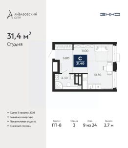 Продается 1-комн. квартира-студия от застройщика с предчистовой отделкой в ЖК ''Айвазовский City'' на 9 этаже. Общая площадь: 31.4 кв.м., площадь гостиной 21.3 кв.м., из которых 10.3 кв.м. выделено под кухонную зону. Все окна выходят на одну сторону. В квартире один совмещенный санузел. Высота потолков 2.7 м. Дом монолитный, многоподъездный, переменной этажности, от 14 до 24 этажей. Квартира находится в 3-й секции высотой 24 этажа в корпусе ГП-8. На этаже 7 квартир. В подъезде 1 пассажирский и 1 грузовой лифт. Окончание строительства - 3 квартал 2026 года. Оформление сделки по договору долевого участия. Новый жилой район располагается в живописном месте на берегу Туры в центральной части города. Принципиально новое пространство для жизни в центре современного города для тех, чьи мечты сбываются, кто нацелен на постоянный рост, перемены к лучшему для себя и своих близких.Каждая деталь Айвазовский City вдохновляет и заряжает на новые свершения: авторская архитектура, сбалансированная продуманная инфраструктура, дизайнерские дворы со спортивными и детскими площадками, парковые зоны с фонтанами, водный канал, украшающий центральный прогулочный маршрут района и многое другое. В 2019 года проект стал лауреатом престижной премии Urban Awards 2019 в номинации ''Лучший строящийся региональный жилой комплекс бизнес-класса''. Главная особенность Айвазовский City - соседство разных архитектурных школ в рамках одного дома. Изысканная классика, выразительная эклектика и оригинальный модерн - жить в одном из таких домов настоящий повод для гордости. Айвазовский City это идеальное сочетание комфорта, технологий и развитой инфраструктуры. Вход в подъезд возможен с улицы и со двора. Отправляясь на работу или за покупками, жители могут выйти с внешней стороны дома, а для прогулки с ребенком со стороны двора. Экологически чистые материалы и энергосберегающие технологии, качественное освещение общественных зон, видеонаблюдение по всей территории жилого района (в том числе в подъездах, лифтах и в подземном паркинге), закрытые дворы с доступом только для жителей Айвазовский City. Часть домов в Айвазовский City будут оснащены подземным паркингом. Востребованный в нашем климатическом поясе формат хранения автомобилей защитит собственность владельца в любое время года. Аккредитация в банках: ''Сбербанк России'', ПАО ''Газпромбанк'', ОАО ''Альфа-Банк'', ПАО Банк ''ВТБ'', ПАО ''Промсвязьбанк'' и других. #ZStoD8