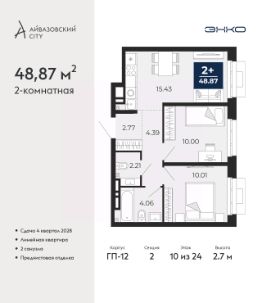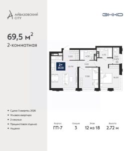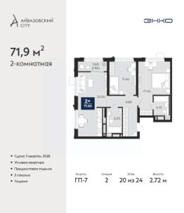 Двухкомнатная квартира с предчистовой отделкой в ЖК ''Айвазовский City'' на 14 этаже. Общая площадь: 61.5 кв.м., жилая: 24 кв.м., площадь просторной кухни-столовой: 20.6 кв.м. Угловая квартира, очень светлая, естественная вентиляция при открытии окон. В квартире одна лоджия, два совмещенных санузла. Высота потолков 2.72 м. Дом монолитный, многоподъездный, переменной этажности, от 9 до 24 этажей. Квартира находится в 4-й секции высотой 18 этажей в корпусе ГП-7. На этаже 5 квартир. В подъезде 1 пассажирский и 2 грузовых лифта. Окончание строительства - 3 квартал 2026 года. Оформление сделки по договору долевого участия. Новый жилой район располагается в живописном месте на берегу Туры в центральной части города. Принципиально новое пространство для жизни в центре современного города для тех, чьи мечты сбываются, кто нацелен на постоянный рост, перемены к лучшему для себя и своих близких.Каждая деталь Айвазовский City вдохновляет и заряжает на новые свершения: авторская архитектура, сбалансированная продуманная инфраструктура, дизайнерские дворы со спортивными и детскими площадками, парковые зоны с фонтанами, водный канал, украшающий центральный прогулочный маршрут района и многое другое. В 2019 года проект стал лауреатом престижной премии Urban Awards 2019 в номинации ''Лучший строящийся региональный жилой комплекс бизнес-класса''. Главная особенность Айвазовский City - соседство разных архитектурных школ в рамках одного дома. Изысканная классика, выразительная эклектика и оригинальный модерн - жить в одном из таких домов настоящий повод для гордости. Айвазовский City это идеальное сочетание комфорта, технологий и развитой инфраструктуры. Вход в подъезд возможен с улицы и со двора. Отправляясь на работу или за покупками, жители могут выйти с внешней стороны дома, а для прогулки с ребенком со стороны двора. Экологически чистые материалы и энергосберегающие технологии, качественное освещение общественных зон, видеонаблюдение по всей территории жилого района (в том числе в подъездах, лифтах и в подземном паркинге), закрытые дворы с доступом только для жителей Айвазовский City. Часть домов в Айвазовский City будут оснащены подземным паркингом. Востребованный в нашем климатическом поясе формат хранения автомобилей защитит собственность владельца в любое время года. Аккредитация в банках: ОАО ''Альфа-Банк'', ''Сбербанк России'', ПАО Банк ''ВТБ'', ПАО ''Газпромбанк'', ПАО Банк ''ФК Открытие'' и других. #250cw4