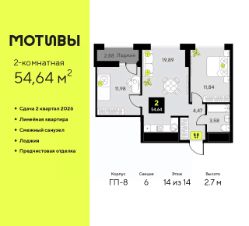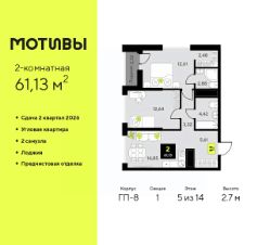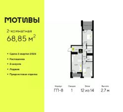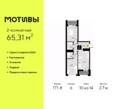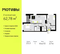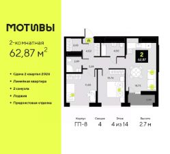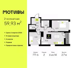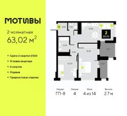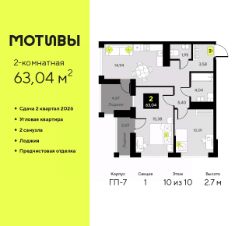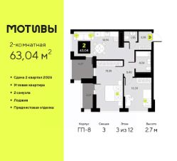 2-комн. квартира от застройщика с предчистовой отделкой в ЖК ''Мотивы'' на 5 этаже. Общая площадь: 63.04 кв.м., жилая: 25.77 кв.м., площадь просторной кухни-столовой: 14.94 кв.м. Квартира угловая, очень светлая, естественная вентиляция при открытии окон. В квартире две лоджии, один совмещенный и один раздельный санузел. Высота потолков 2.7 м. Квартира будет сдаваться с предчистовой отделкой White Box: выровнены и оштукатурены стены, проведено электричество и отопление, установлены радиаторы. Вы также можете приобрести квартиру с ремонтом от застройщика, представленным в трех цветовых решениях Scandi, Wood и Coffee и включающим ламинат, обои под покраску, двери, натяжной потолок и санузел с сантехникой. При желании вы можете заказать отделку под ключ, варианты возможных решений представлены в альбоме фотографий. Дом монолитный, трехподъездный, высотой 10 этажей. Квартира находится в 3-й секции в корпусе ГП-7. На этаже 5 квартир. В подъезде 1 пассажирский и 1 грузовой лифт. Окончание строительства - 2 квартал 2026 года. Оформление сделки по договору долевого участия. Закрытая от автомобилей территория, безопасный двор и камеры видеонаблюдения - гаранты вашего спокойствия. Квартал будет располагать богатой инфраструктурой: на первых этажах разместятся магазины, пекарни, кофейни, пункты выдачи, аптеки, детские центры, цветочные салоны и многое другое, что сделает жизнь поистине комфортной. Рядом находится парк общей площадью почти 5000 м², в котором располагаются локации для игр и отдыха жителей, здесь можно совершить утреннюю пробежку или прогуляться после рабочего дня. В парке есть зона воркаута с тренажерами для взрослых, игровые комплексы с горками и канатный комплекс для детей разных возрастов, качели и лавочки для отдыха, площадки для командных видов спорта и для панна-футбола. В ЖК ''Мотивы'' всё продумано до мелочей: светлые холлы входных групп, оформленные в едином стиле, просторные колясочные, лапомойки для питомцев. На территории комплекса находятся 2 8-ми этажных паркинга и более 1000 м/м на открытой парковке. Жилой комплекс находится в одном из экологически благоприятных районов Тюмени, недалеко от Плехановского бора. При этом до центра города можно добраться за 15 минут, а до международного аэропорта Рощино за 13 минут. Окончание строительства: ГП 1, 2, 3, 4 сдача до конца 2024 года, ГП 6, 7, 8 сдача 2 квартал 2026 года. #zwddCd