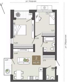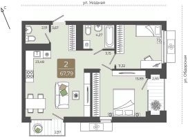 Двухкомнатная квартира в ЖК ''Мидгард на Уездной'' на 8 этаже. Квартира без отделки, после получения ключей можно делать ремонт. Общая площадь: 65.18 кв.м., жилая: 25.1 кв.м., площадь просторной кухни-столовой: 22.33 кв.м. Угловая квартира, окна oбecпeчивaют paвнoмepнoe ocвeщeниe в тeчeниe дня. В квартире одна лоджия, два совмещенных санузла. Высота потолков 2.72 м. Дом монолитный, черырехподъездный, переменной этажности, от 9 до 15 этажей. Квартира находится во 2-й секции высотой 9 этажей в корпусе ГП-1. На этаже 6 квартир. В подъезде 1 пассажирский и 1 грузовой лифт. Окончание строительства - 3 квартал 2027 года. Оформление сделки по договору долевого участия. ''Мидгард на Уездной'' - современный проект комфорт-класса, расположенный на первой линии Тюменской слободы, с видом на развязку Московского тракта. Он сочетает в себе современные архитектурные решения и комфортное проживание в гармонии с природой. Жилой комплекс находится в перспективном районе, который отличается транспортной доступностью: до крупных торговых центров ''Кристалл'' и ''Колумб'' можно добраться за 10 минут, а до центра города - за 15 минут. В шаговой доступности школы, детские сады, торговые центры и парки, что делает локацию идеальной для комфортной жизни. Проектом предусмотрены дома с дизайнерскими входными зонами и планировочными решения для любого сценария жизни с возможностью включить в ипотечный платеж ремонт, мебель и технику от застройщика. Закрытый двор и собственная аллея вдоль жилого комплекса позволят насладиться тишиной вдали от суеты большого города. #2MCOT9