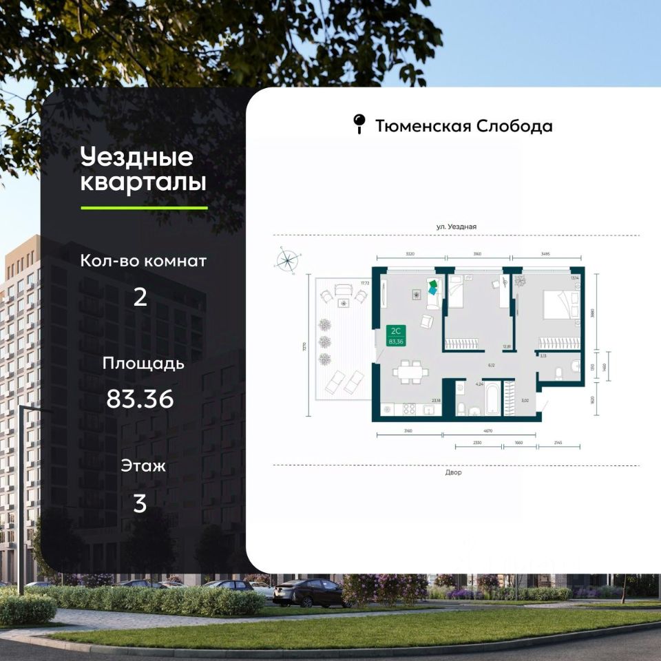 Продается двухкомнатная квартира в ЖК ''Уездные кварталы'' на 3 этаже. Квартира без отделки, полностью готова к ремонту. Общая площадь: 83.36 кв.м., жилая: 25.82 кв.м., площадь просторной кухни-столовой: 23.18 кв.м. Угловая квартира, идеально подойдет любителям тишины и панорамных видов. В квартире один балкон, один совмещенный и один раздельный санузел. Терраса представляет собой роскошную зону отдыха, где вы на свой вкус можете создать атмосферу комфорта и уюта. Высота потолков 2.7 м. Дом монолитный, многоподъездный, переменной этажности, от 7 до 17 этажей. Квартира находится в 3-й секции высотой 8 этажей в корпусе ГП-3. На этаже 5 квартир. В подъезде 1 грузовой лифт. Окончание строительства - 1 квартал 2026 года. Оформление сделки по договору долевого участия. ''Уездные кварталы'' - семейный жилой комплекс комфорт-класса с авторской архитектурой и трехуровневым ландшафтным озеленением. Рядом расположены крупные транспортные развязки, которые позволяют добраться в любую точку города за 15 минут. Жилой комплекс находится в современном районе с развитой инфраструктурой, на первой линии Тюменской Слободы. Вокруг есть всё необходимое в шаговой доступности: новые детские сады и школы, остановки общественного транспорта, магазины, кафе и рестораны, поликлиника, детская школа искусств, парки и спортивный комплекс. На первых этажах квартала расположена собственная коммерческая сеть, а также свой соседский центр. Проект включает 5 домов переменной этажности с более чем 100 планировками - с террасами, французскими балконами и мастер-спальнями. Закрытые дворы оборудованы интерактивными площадками для игр, спортивными зонами и местами тихого отдыха. Вдоль жилого комплекса расположен пешеходный бульвар с сухим фонтаном, а для автомобилей предусмотрен теплый паркинг. Часть квартир можно приобрести с ремонтом, мебелью и техникой от застройщика, а расходы включить в ипотечный платеж. #zmSCT7