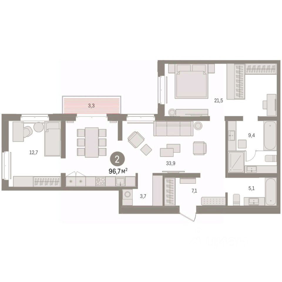 Двухкомнатная квартира с предчистовой отделкой в Кварталы ''На Минской'' на 7 этаже. Общая площадь: 96.72 кв.м. Высота потолков 2.7 м. Дом монолитный, многоподъездный, переменной этажности, от 7 до 16 этажей. Квартира находится в 5-й секции высотой 8 этажей в корпусе 1. На этаже 6 квартир. В подъезде 1 грузовой лифт. Окончание строительства - 4 квартал 2026 года. Оформление сделки по договору долевого участия. Квартира с кухней-гостиной и двумя спальнями в кварталах ''На Минской''. Особенности планировки: балкон, гардеробная, мастер-спальня, окна в пол, окно в санузле, панорамное остекление, предчистовая отделка, разнесённые спальни. квартиры в нашей базе: МНС01-Ж5.7.3. В сердце города Кварталы ''На Минской'' находятся в самом центре. За десять минут можно дойти до площади 400-летия Тюмени и Большого Драматического театра, Тюменского индустриального и медицинского университетов, спортивного комплекса ''Строймаш'', ТРЦ ''Гудвин'' и ''Премьер'', Тюменского технопарка. Поблизости много детских садов, школ и поликлиник. Пространство разного опыта Создавая кварталы ''На Минской'' мы вдохновлялись Хакскими дворами в Берлине и улицей Давида Агмашенебели в Тбилиси. И первые и вторая — яркие разнообразные пространства, сформированные прогрессивными архитекторами и притягивающие городских интеллектуалов. Престижная недвижимость здесь соседствует с барами, ресторанами, креативными кластерами и бюро, дизайнерскими лавками. Полезные улицы Кварталы ''На Минской'' свяжет сеть променадов, автомобильных проездов и велодорожек. Уличный фронт проекта мы сформируем с помощью аллейной посадки деревьев. Они создадут тень для ресторанов и кафе на первых этажах, визуально отделят проезжую и пешеходную части, снизят объём пыли и уровень шума. Мы реализуем проект в районе с развитой базовой инфраструктурой. И поэтому тщательно подошли к программированию коммерции, посчитав, что её основная задача — ''закрывать'' более высокие потребности жителей. Здесь может появиться пекарня с вкусными круассанами, турагентство на случай, если захочется перезимовать в Сочи, массажный кабинет, ресторан, когда надоело есть дома и многое другое. #25SCa5