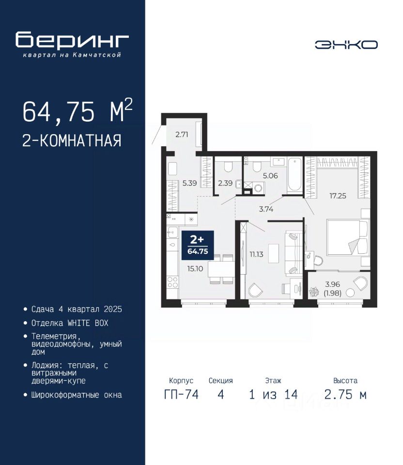 2-комн. квартира от застройщика в ЖК ''Беринг'' на 1 этаже. Квартира без отделки, после получения ключей можно делать ремонт. Общая площадь: 64.75 кв.м., жилая: 28.38 кв.м., площадь просторной кухни-столовой: 15.1 кв.м. Комнаты изолированные, все окна выходят на одну сторону. В квартире одна лоджия, один совмещенный и один раздельный санузел. Высота потолков 2.75 м. Дом монолитный, многоподъездный, переменной этажности, от 9 до 21 этажей. Квартира находится в 4-й секции высотой 14 этажей в корпусе ГП-74. На этаже 7 квартир. В подъезде 1 пассажирский и 1 грузовой лифт. Окончание строительства - 4 квартал 2025 года. Оформление сделки по договору долевого участия. Подобно знаменитому исследователю, мы чувствуем себя первооткрывателями этой локации. Хотим показать новую суть места, сформировать для вас жизненный опыт, которого ещё не было. Беринг — район зелёного цвета. Беринг — район, который откроется вам с другой стороны. Впечатлит новым уровнем комфорта и качеством жизни. Беринг — открытие на карте города. Первый квартал расположен в районе Тура, в границах улиц: Камчатская Западносибирская Энтузиастов. Вокруг уже есть всё для того, чтобы ежедневная рутина была лишь частью жизни и не доставляла дискомфорта. Школы и детские сады, магазины и аптеки, поликлиника, места для семейного отдыха, пеших и велопрогулок, и даже рыбалки. Масштабное озеленение дворов — визитная карточка ЭНКО и ваш оазис спокойствия, чтобы отвлечься от повседневности. Раскидистые деревья, кустарники, травы и цветы — осталось остановиться, вдохнуть и расслабиться, глядя на эту природную красоту. Стилистика подъездов продолжает концепцию Беринга, вдохновлённого Камчаткой: сдержанный, но при этом впечатляющий дизайн соседствует с удобством и функциональностью. #zU5Ttf