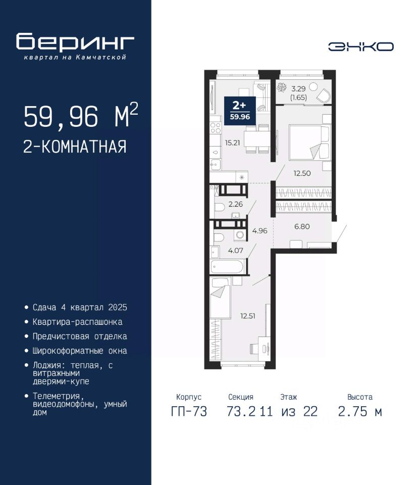 Двухкомнатная квартира с предчистовой отделкой в ЖК ''Беринг'' на 11 этаже. Общая площадь: 59.96 кв.м., жилая: 25.01 кв.м., площадь просторной кухни-столовой: 15.21 кв.м. Квартира - распашонка, без проходных комнат, окна выходят на paзные стороны дома. В квартире одна лоджия, один совмещенный и один раздельный санузел. Высота потолков 2.75 м. Дом монолитный, многоподъездный, переменной этажности, от 9 до 22 этажей. Квартира находится в 73.2-й секции высотой 22 этажа в корпусе ГП-73. На этаже 7 квартир. В подъезде 1 пассажирский и 1 грузовой лифт. Окончание строительства - 4 квартал 2025 года. Оформление сделки по договору долевого участия. Подобно знаменитому исследователю, мы чувствуем себя первооткрывателями этой локации. Хотим показать новую суть места, сформировать для вас жизненный опыт, которого ещё не было. Беринг — район зелёного цвета. Беринг — район, который откроется вам с другой стороны. Впечатлит новым уровнем комфорта и качеством жизни. Беринг — открытие на карте города. Первый квартал расположен в районе Тура, в границах улиц: Камчатская Западносибирская Энтузиастов. Вокруг уже есть всё для того, чтобы ежедневная рутина была лишь частью жизни и не доставляла дискомфорта. Школы и детские сады, магазины и аптеки, поликлиника, места для семейного отдыха, пеших и велопрогулок, и даже рыбалки. Масштабное озеленение дворов — визитная карточка ЭНКО и ваш оазис спокойствия, чтобы отвлечься от повседневности. Раскидистые деревья, кустарники, травы и цветы — осталось остановиться, вдохнуть и расслабиться, глядя на эту природную красоту. Стилистика подъездов продолжает концепцию Беринга, вдохновлённого Камчаткой: сдержанный, но при этом впечатляющий дизайн соседствует с удобством и функциональностью. #zuSt2O